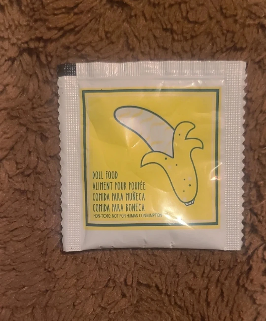 Im giving away a Baby Alive Doll food packet for free in a sealed package, perfect for your doll! It is labeled 'Aliment Pour Poupée'. Please note: Non-toxic, not for human consumption!