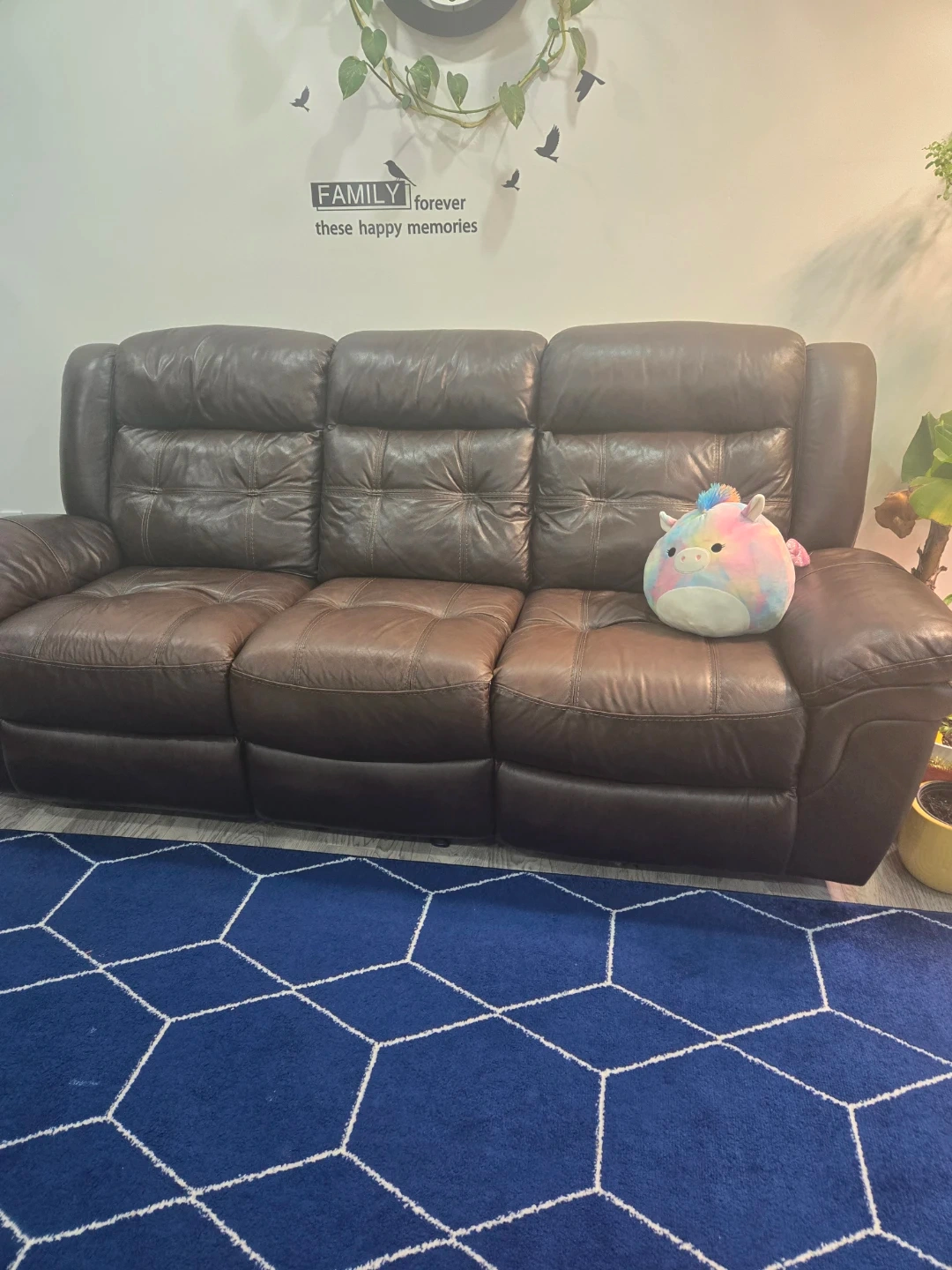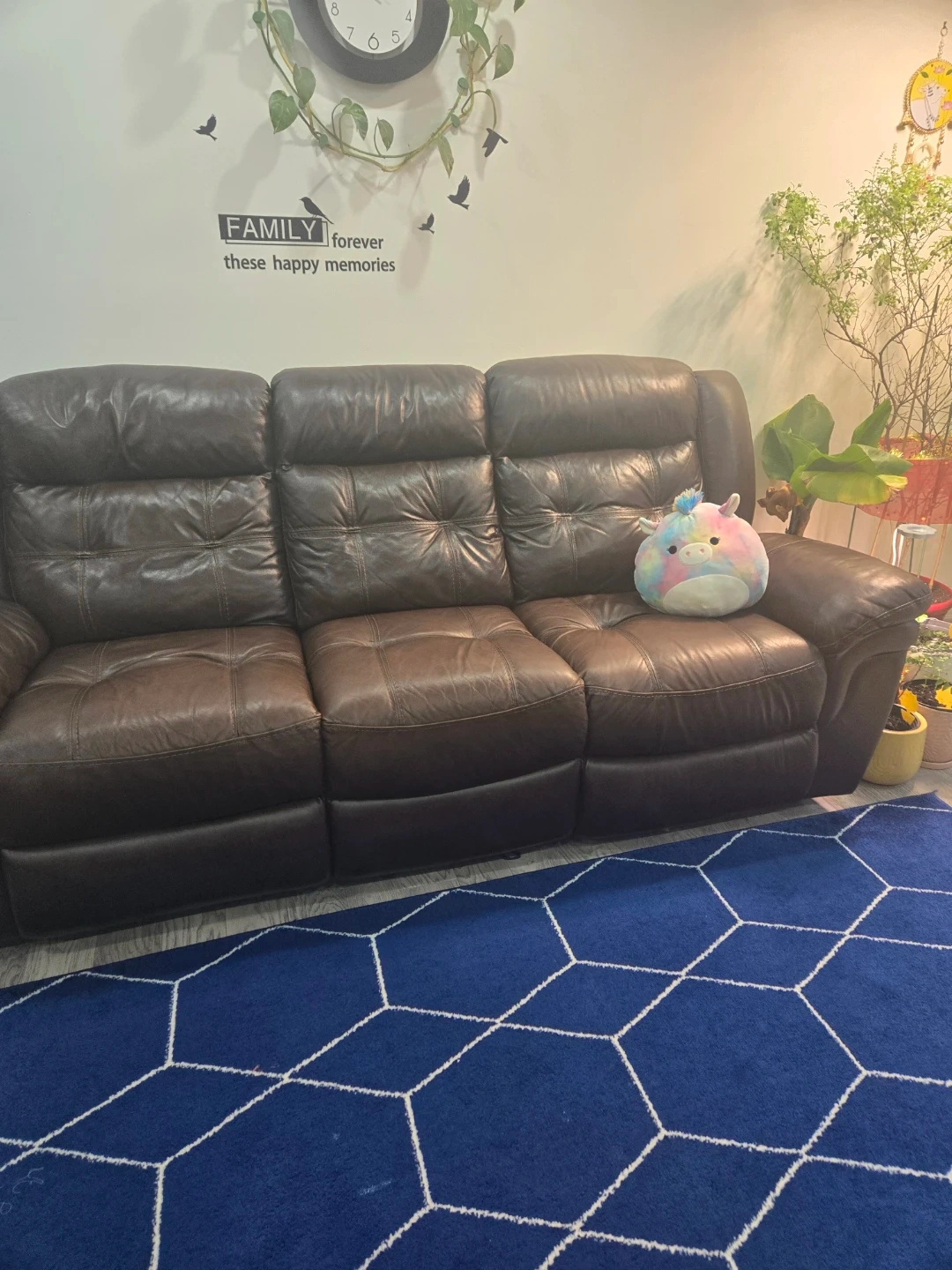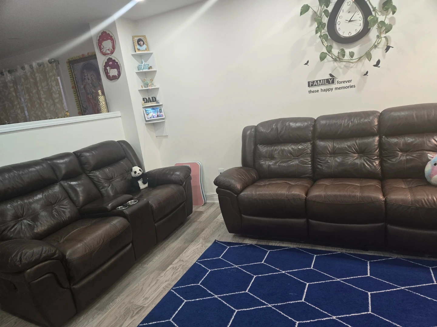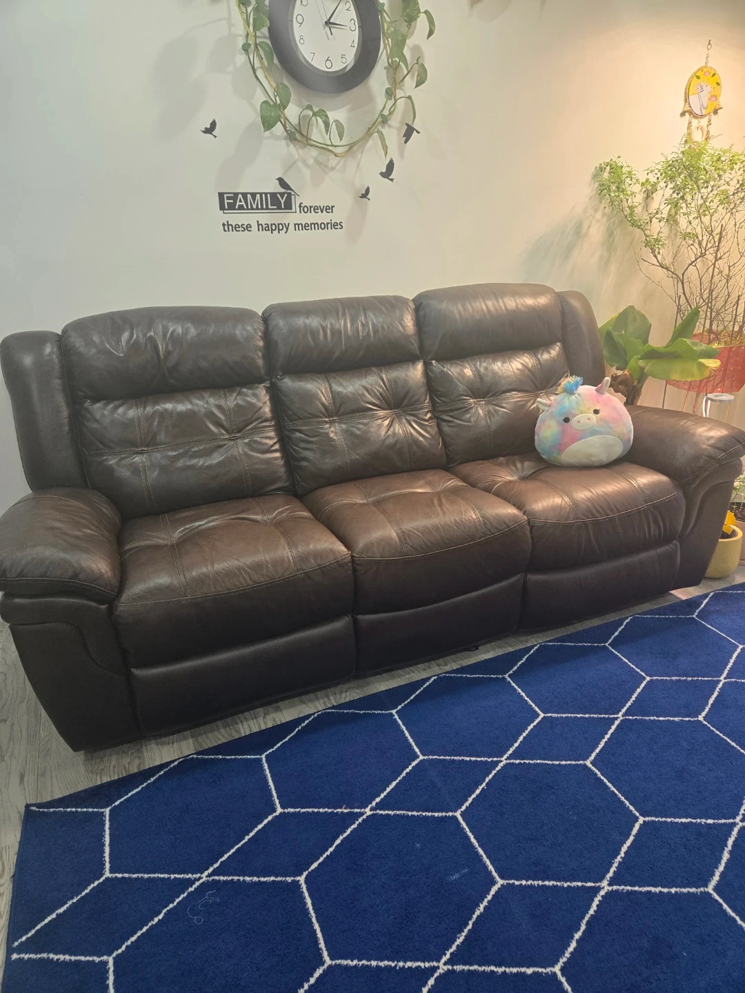 Selling a brown leather reclining sofa set. Includes a three-seater sofa and a two-seater sofa with a console and cupholders. It is in excellent condition.