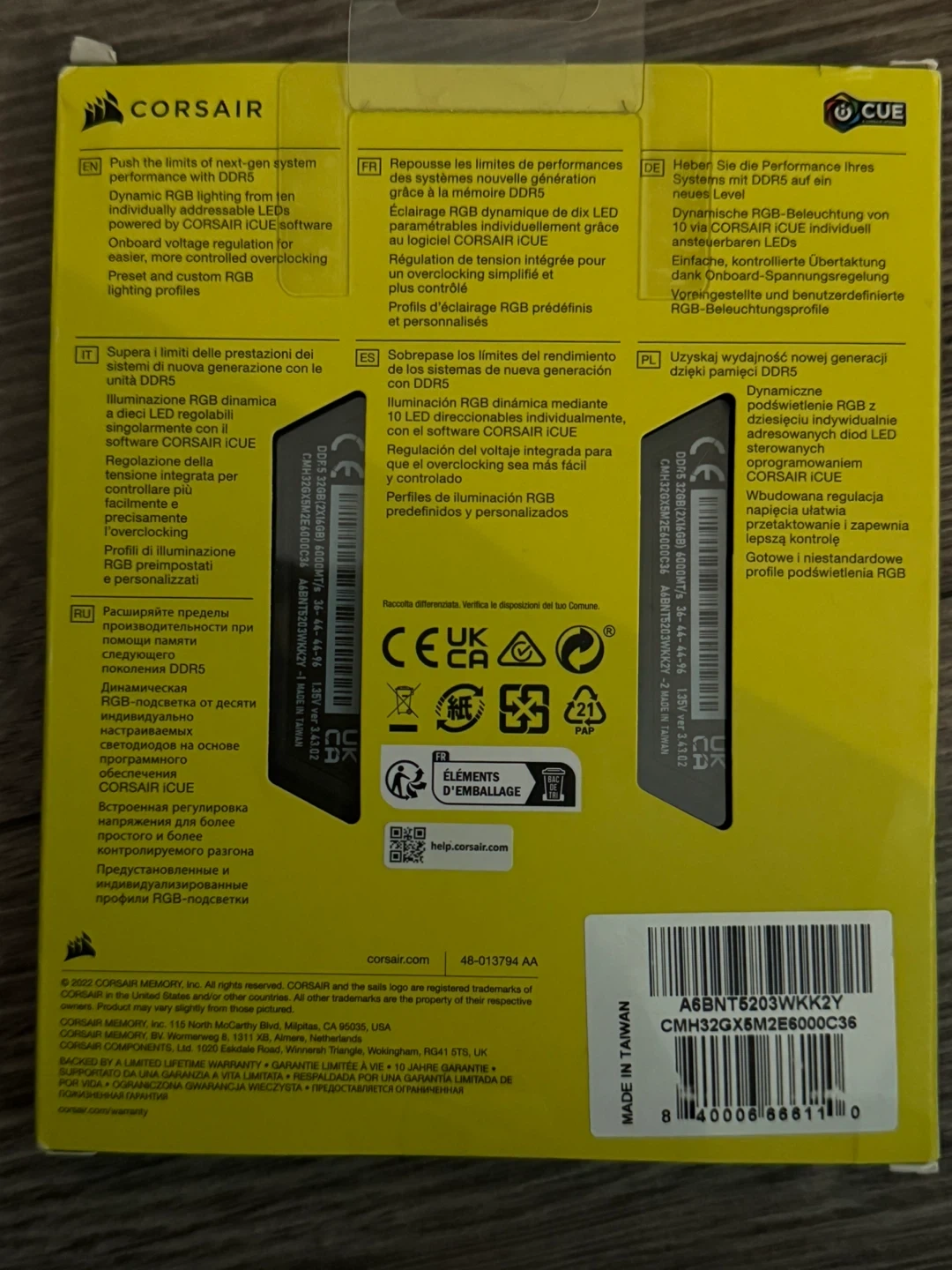 Selling a Corsair Vengeance RGB DDR5 32GB (2x16GB) 6000MHz CL36 Desktop RAM Kit in black! This kit is Intel XMP 3.0 compatible and comes with the box. It offers dynamic RGB lighting and onboard voltage regulation for overclocking. Performance DDR5 DRAM, Intel XMP Ready and powered by CORSAIR iCUE software. Brand new never used
