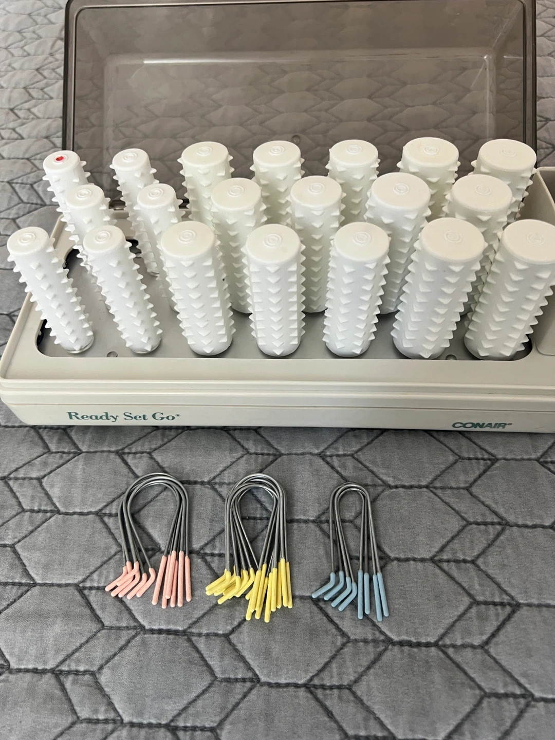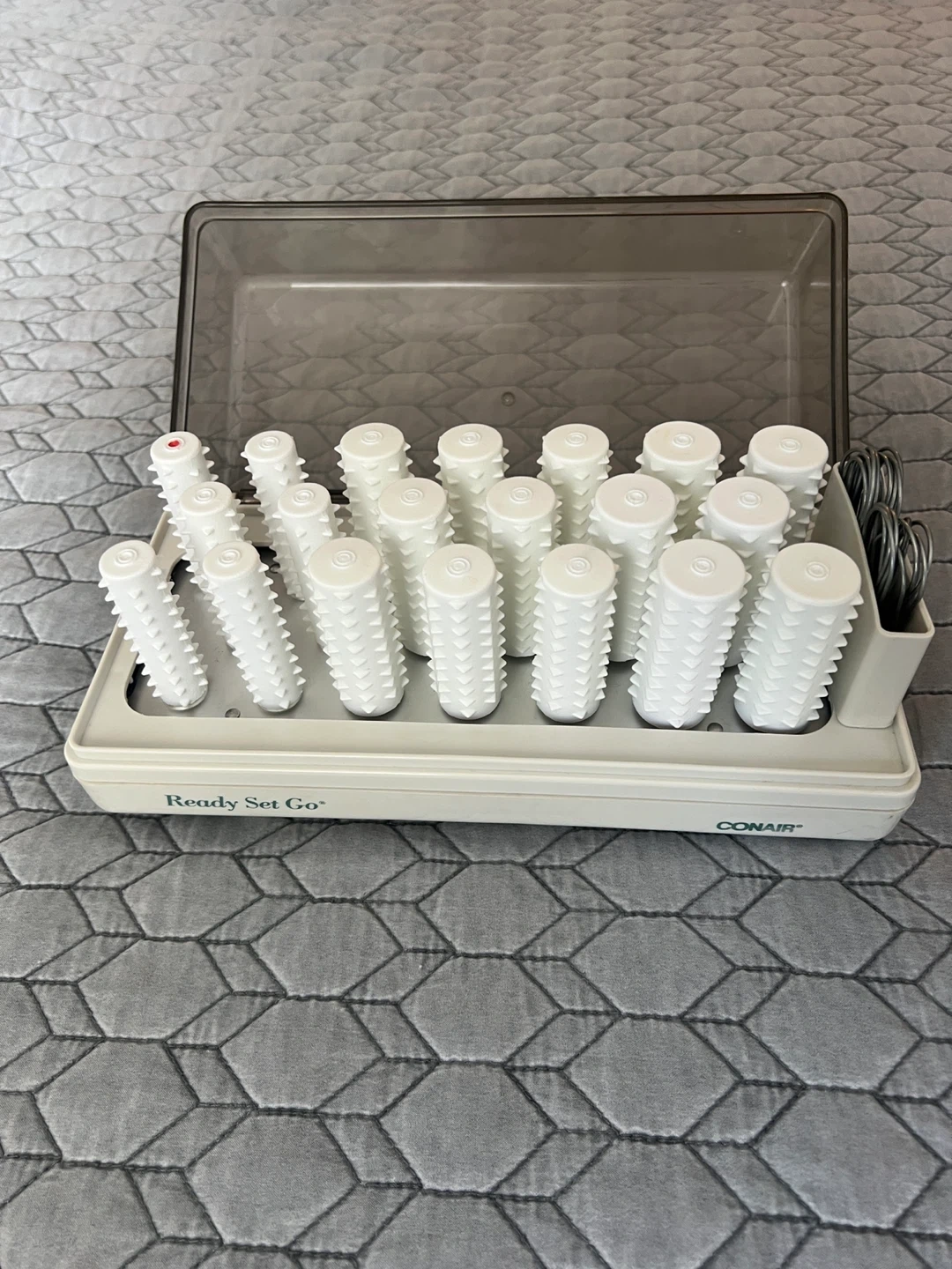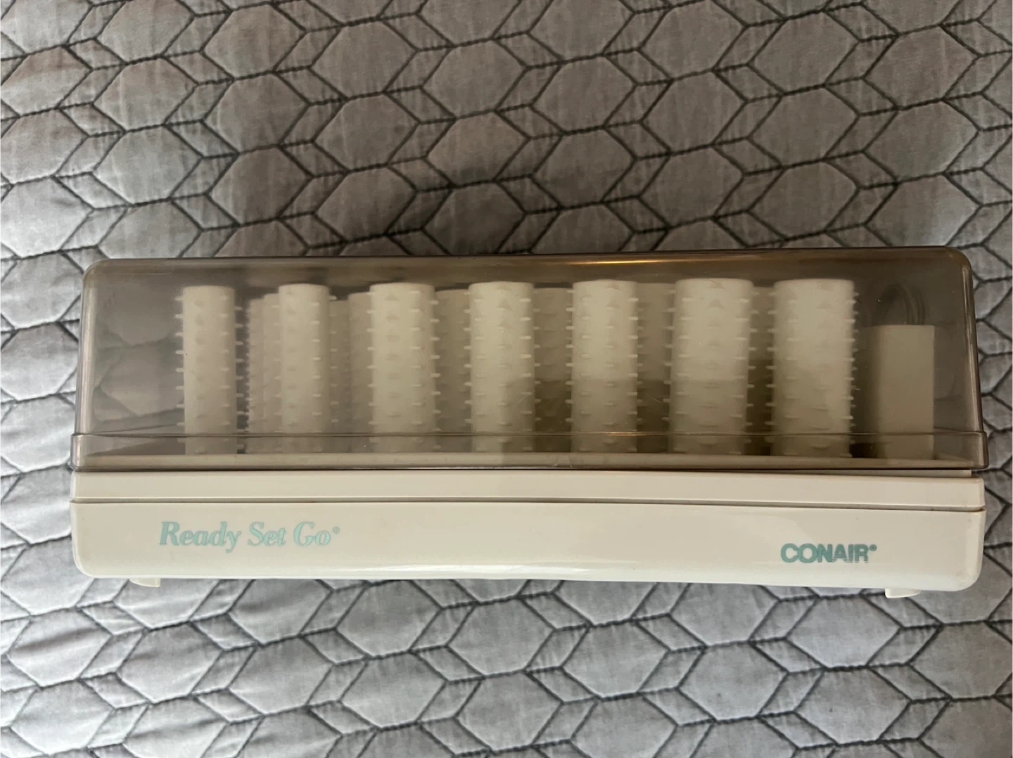 Conair Ready Set Go heated roller set in excellent working condition. Includes all rollers, color-coded clips, and storage lid. Heats up properly and has been well cared for. Great for volume and classic curls without a curling iron. Clean and ready to use. Model number is HS5NC.