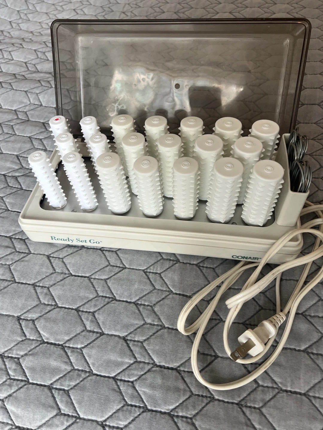 Conair Ready Set Go heated roller set in excellent working condition. Includes all rollers, color-coded clips, and storage lid. Heats up properly and has been well cared for. Great for volume and classic curls without a curling iron. Clean and ready to use. Model number is HS5NC.