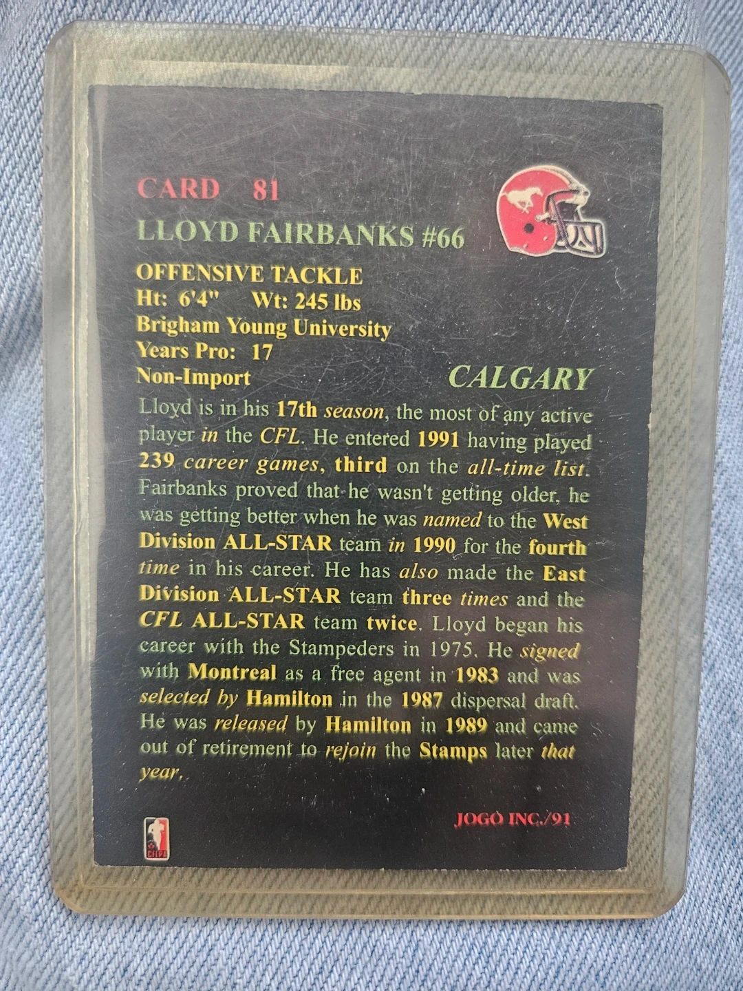 Selling a Lloyd Fairbanks #66 football card. He played Offensive Tackle for the Calgary Stampeders. He is 6'4" and weighs 245 lbs. He played 17 years as a pro. This card is from JOGO INC./91