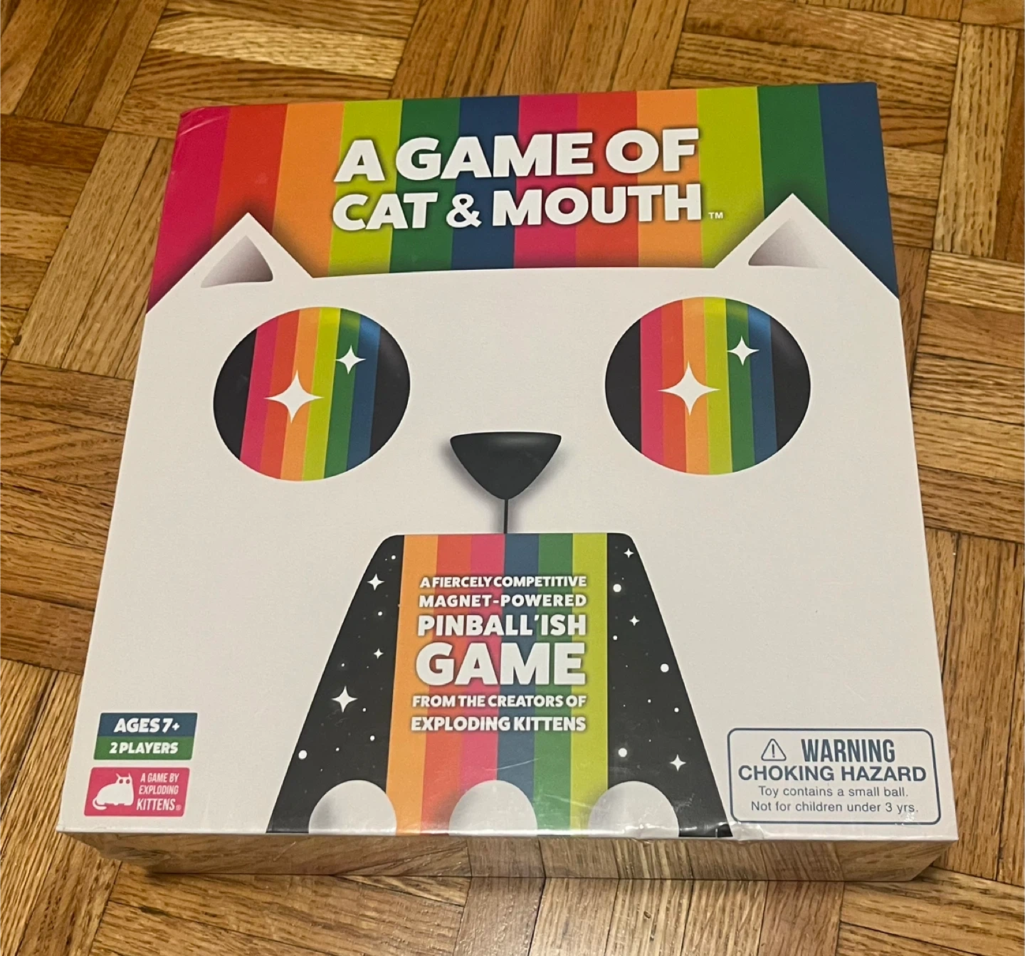 Selling a brand new, sealed copy of A Game of Cat & Mouth! The box contains a folding gameboard/box, 2 magnetic cat paw flickers, 17 plastic balls, cat face, 8 wall bumpers, and instructions.Cash only