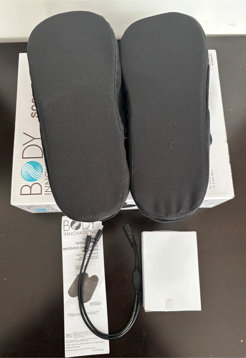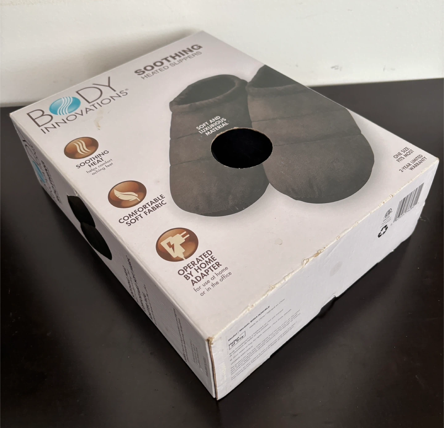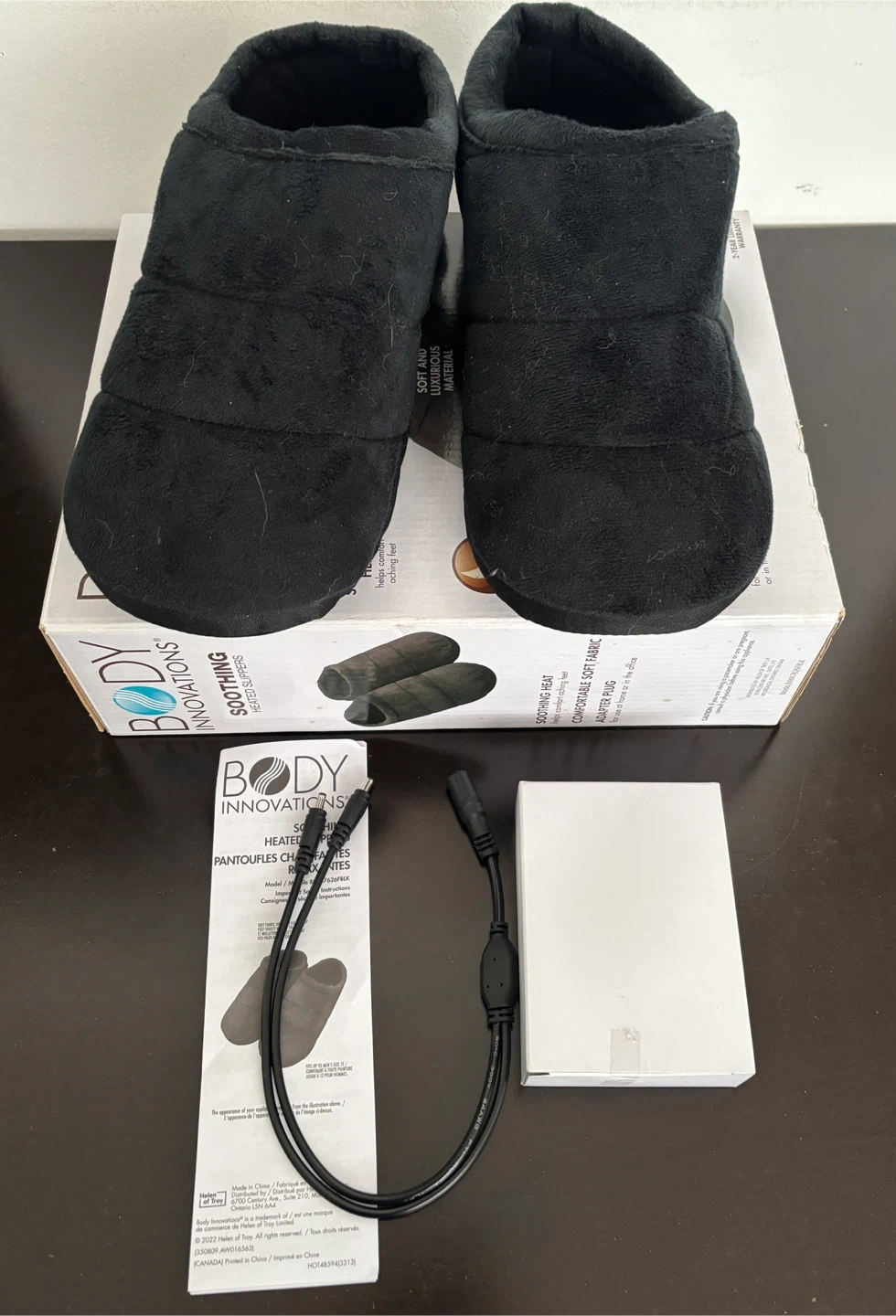 Body Innovations Soothing Heated Slippers. They are made with soft and luxurious material and provide soothing heat for aching feet.
