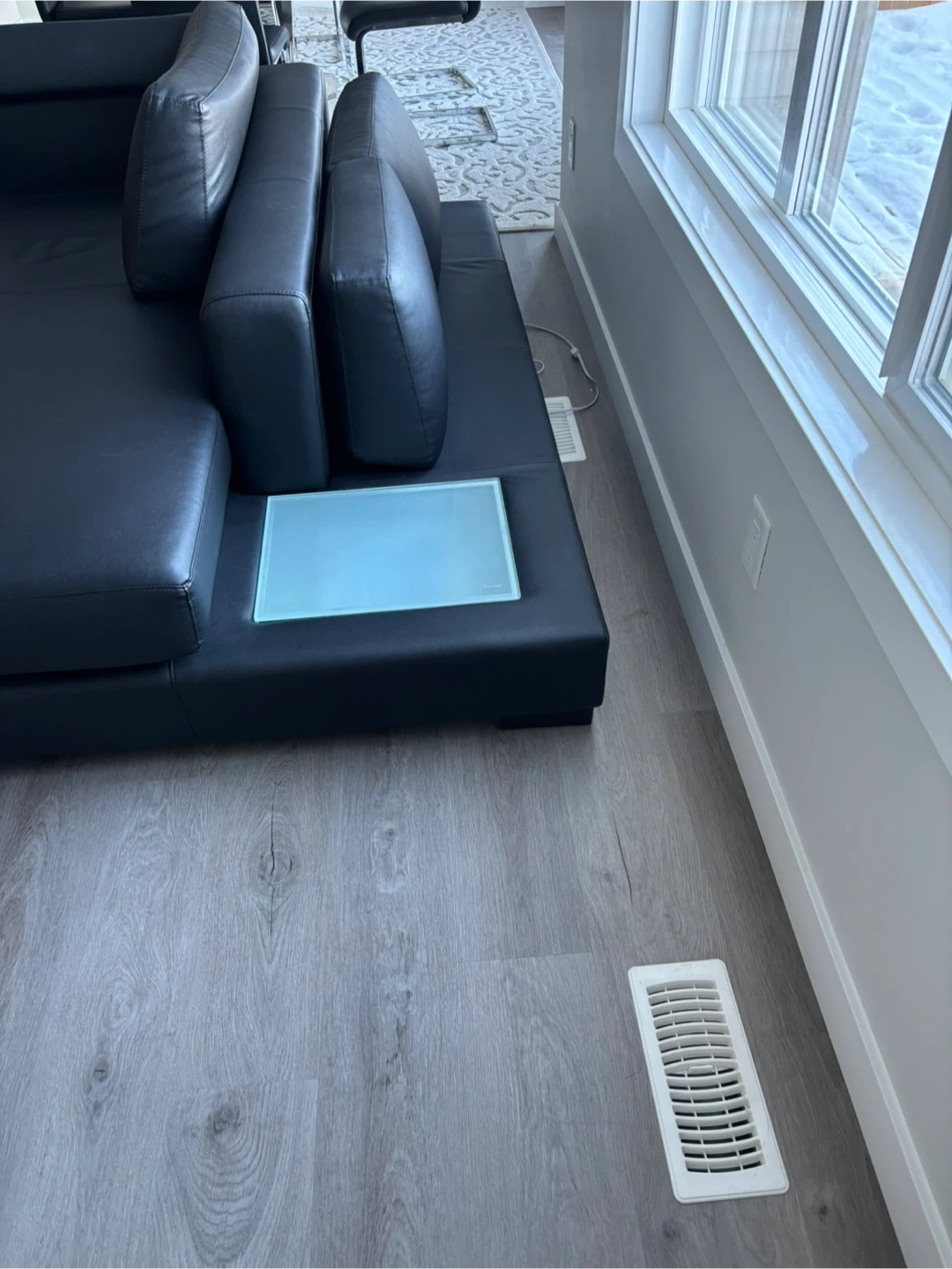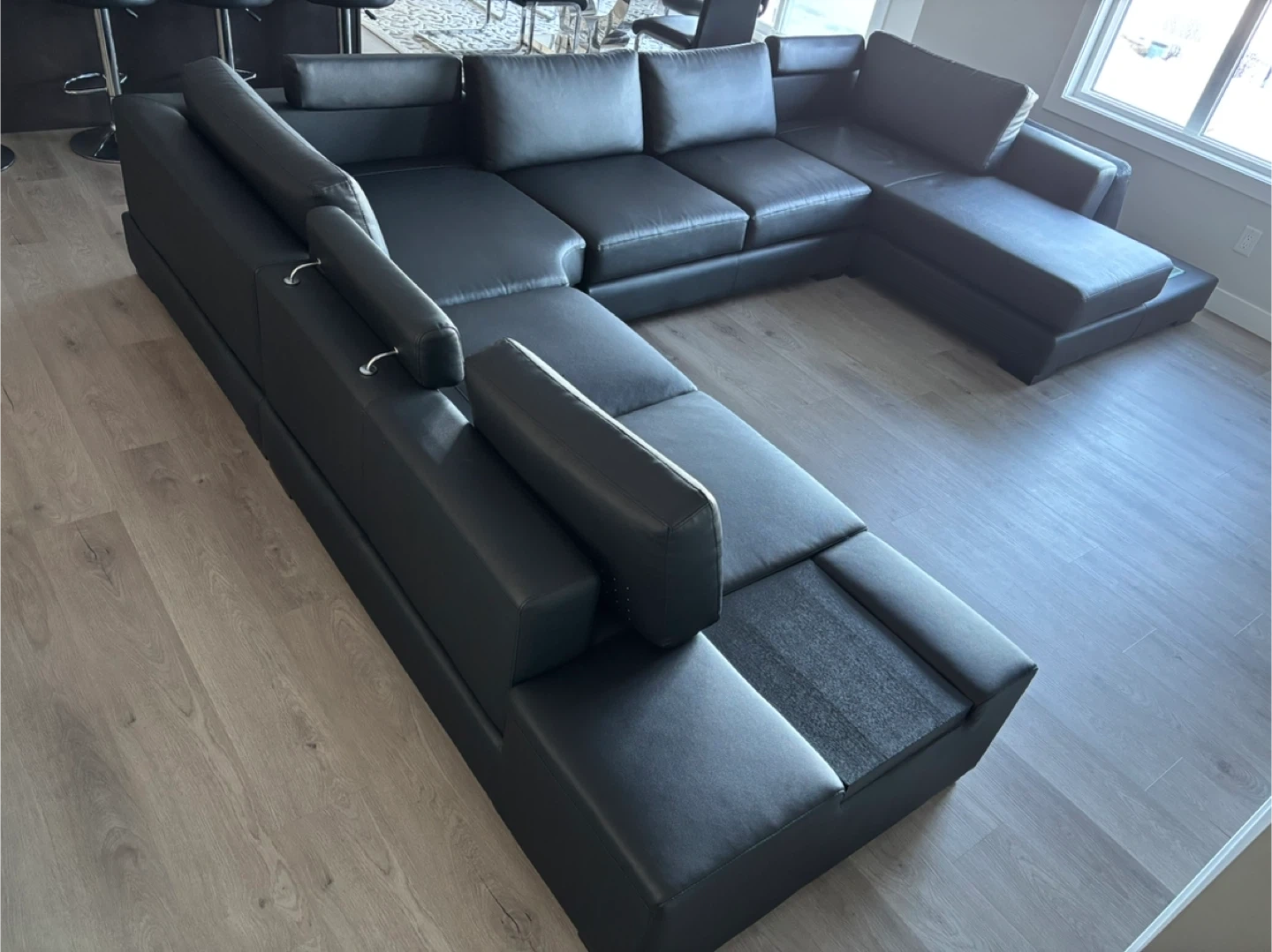 Selling a black leather sectional sofa. This modern piece would be a great addition to any living room. It's in great condition and ready for a new home!