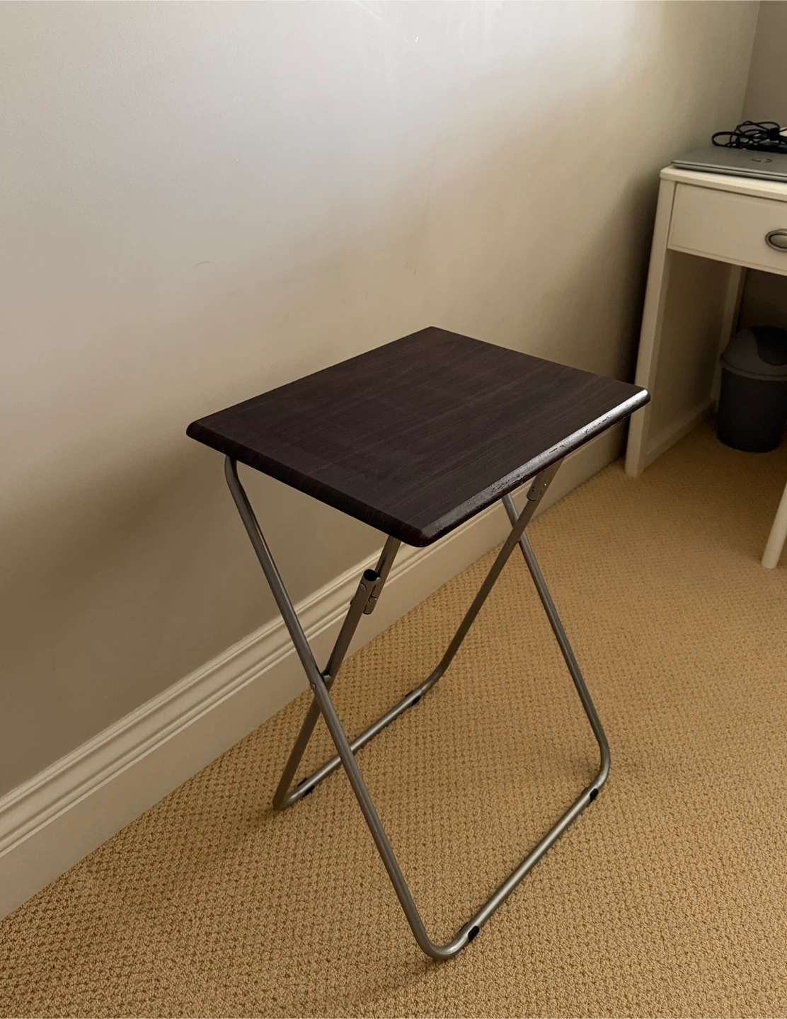 This folding table is perfect for small spaces! It's easy to store when not in use. The top is a dark brown colour and the legs are silver. Great for crafting, snacks, or as a side table