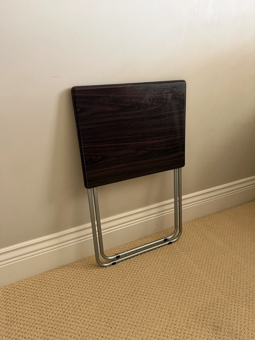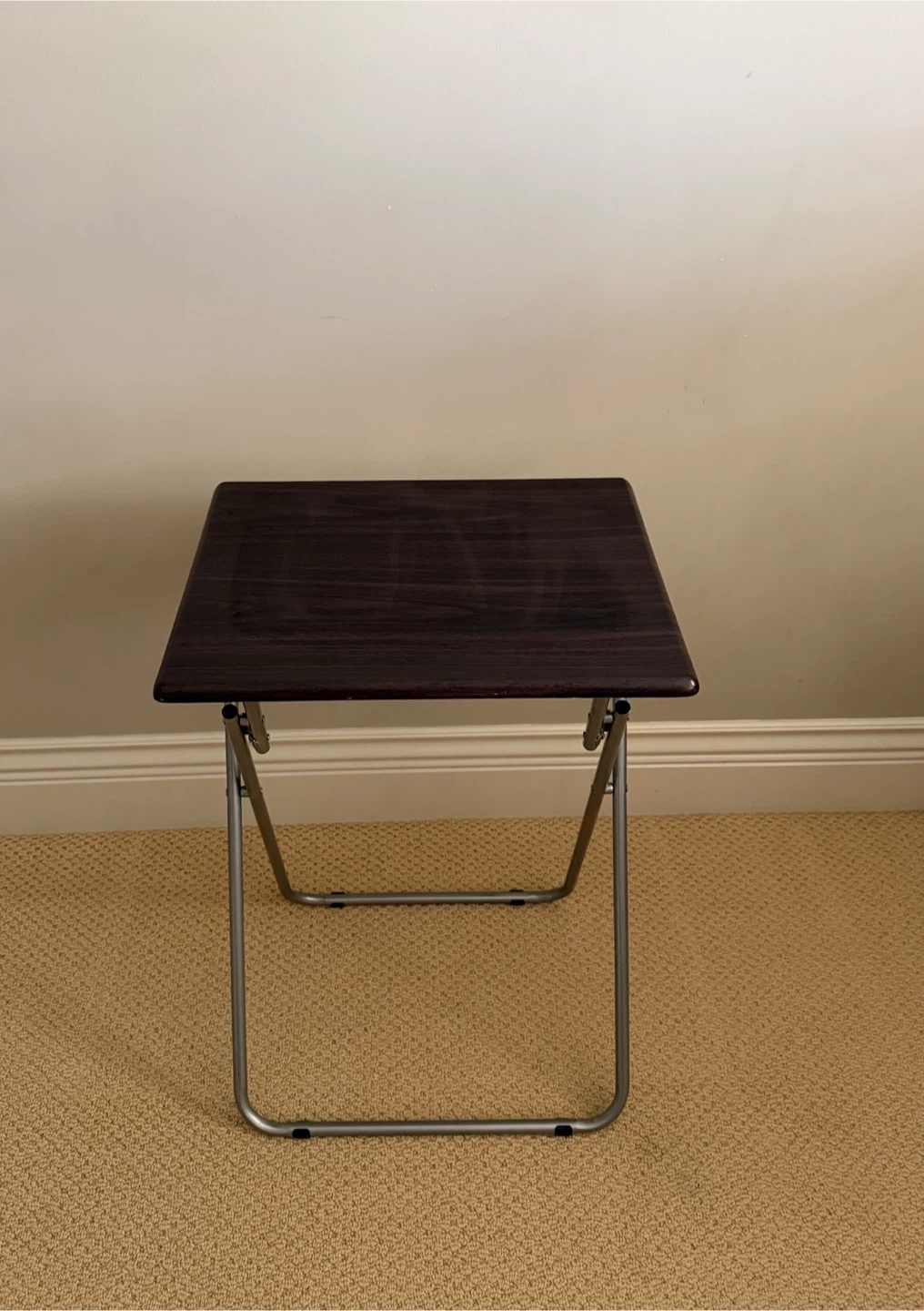 This folding table is perfect for small spaces! It's easy to store when not in use. The top is a dark brown colour and the legs are silver. Great for crafting, snacks, or as a side table