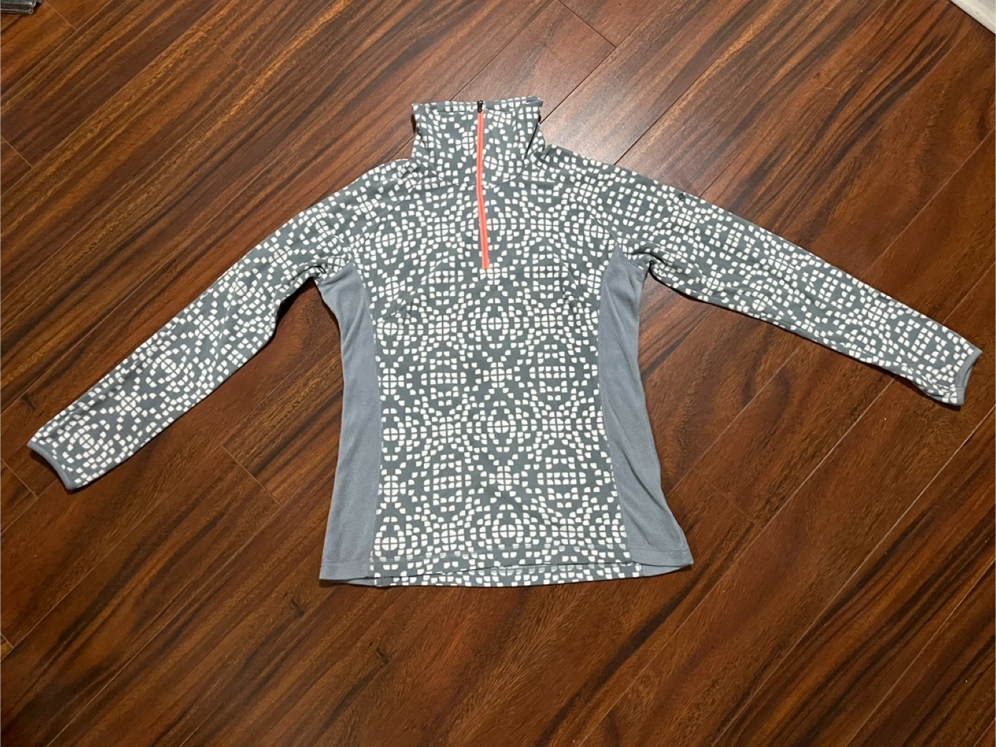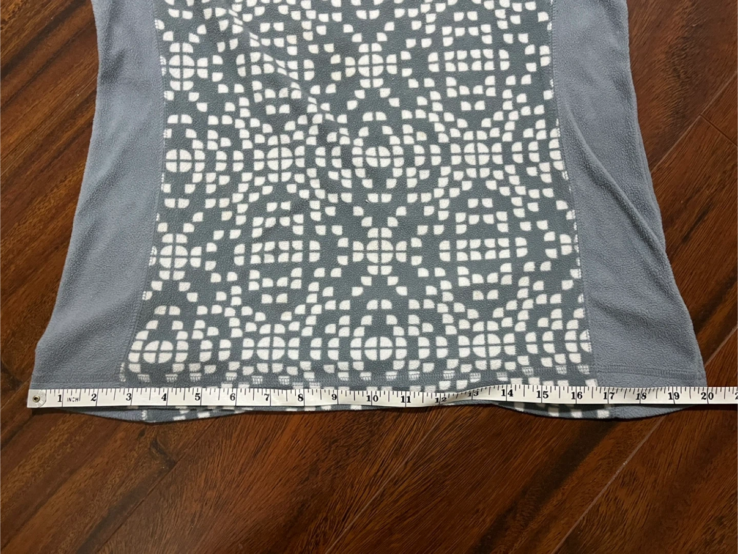 Columbia women’s quarter-zip fleece pullover sweater in size medium. Grey and white abstract pattern with contrast pink zipper trim and solid grey side panels. Excellent condition from a smoke free home.