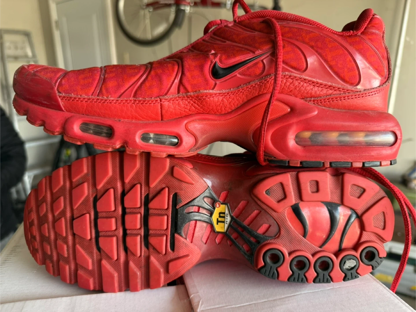 Selling a pair of Nike Air Max Plus TN in a vibrant red colour! These are a size US 10.5. The shoes show some signs of wear, but still have lots of life left in them. Perfect for adding a pop of colour to your wardrobe!