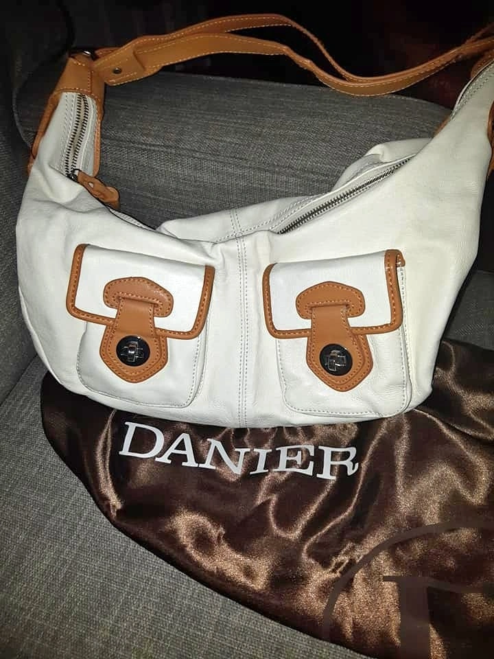 Brand new! Danier leather purse. 2 front pockets with clasp, 2 inside pockets and 1 inside zipper pocket. Tan/cream colour.