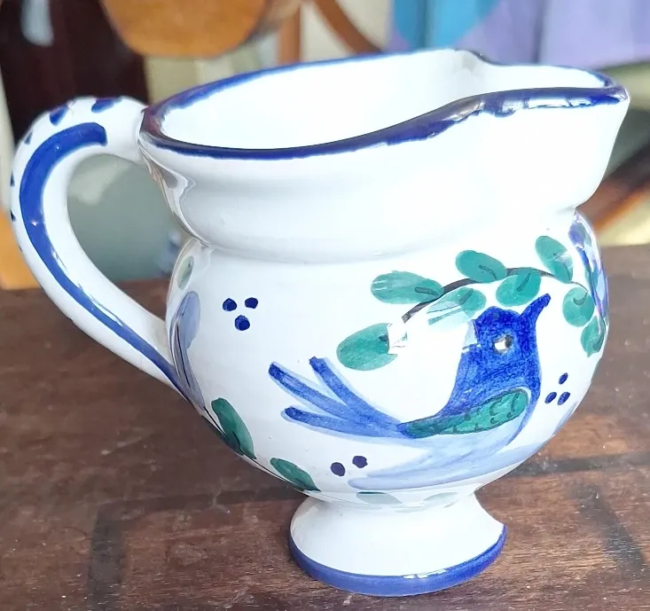 A cute little ceramic creamer pitcher! It features a charming blue bird and leaf design with blue trim. Perfect for adding a touch of whimsy to your table setting