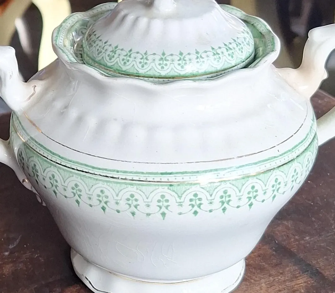 Selling a charming vintage teapot, complete with its lid. It features a delicate green pattern around the edges. Perfect for adding a touch of vintage elegance to your tea time