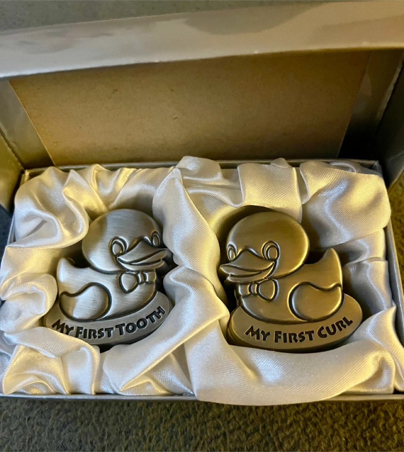 Brand new keepsake box for baby's first tooth and curl! The box is included, with satin lining cradling the two duck-shaped containers. Each container is labelled 'My First Tooth' and 'My First Curl'