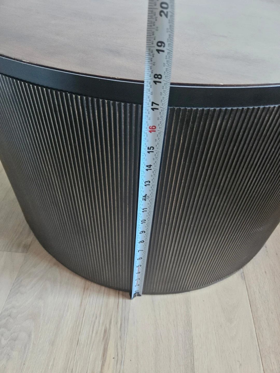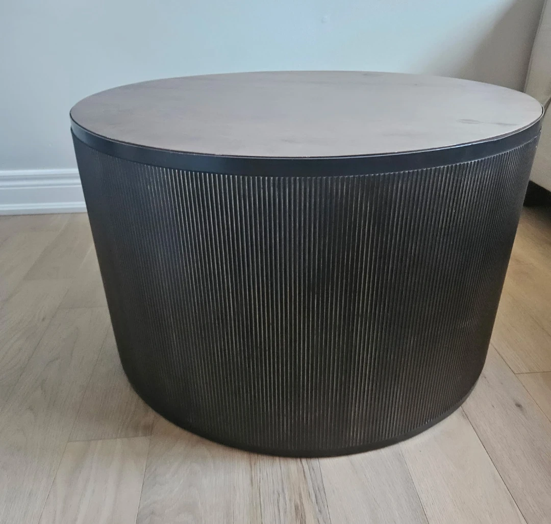 Here's a stylish round coffee table that would look great in any living room! It features a dark brown wood top and a base with a unique ribbed design. It measures approximately 18 inches tall and 29 inches in diameter.
