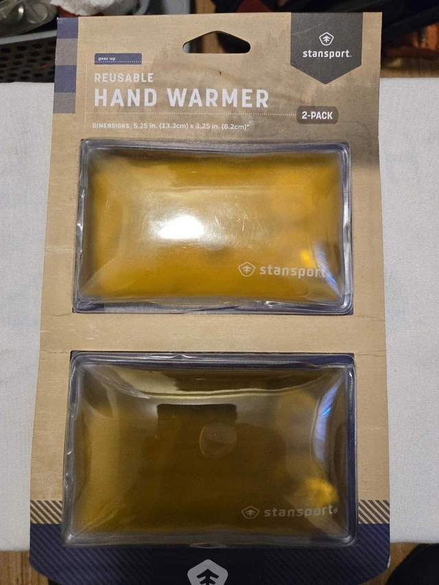 Stay warm during outdoor activities with this Stansport reusable hand warmer 2-pack. Simply snap the metal disc to instantly start a reaction that heats up to 130°F. To recharge, boil in water for 10 to 15 minutes to return to clear liquid form. Generates heat for up to 60 minutes. These are new, never been used. Here are some additional details: