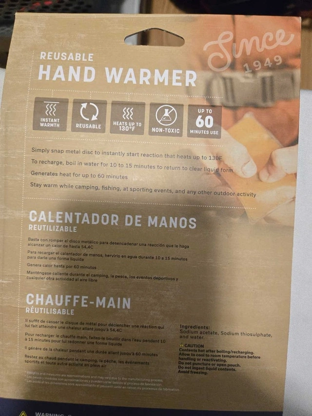Stay warm during outdoor activities with this Stansport reusable hand warmer 2-pack. Simply snap the metal disc to instantly start a reaction that heats up to 130°F. To recharge, boil in water for 10 to 15 minutes to return to clear liquid form. Generates heat for up to 60 minutes. These are new, never been used. Here are some additional details: