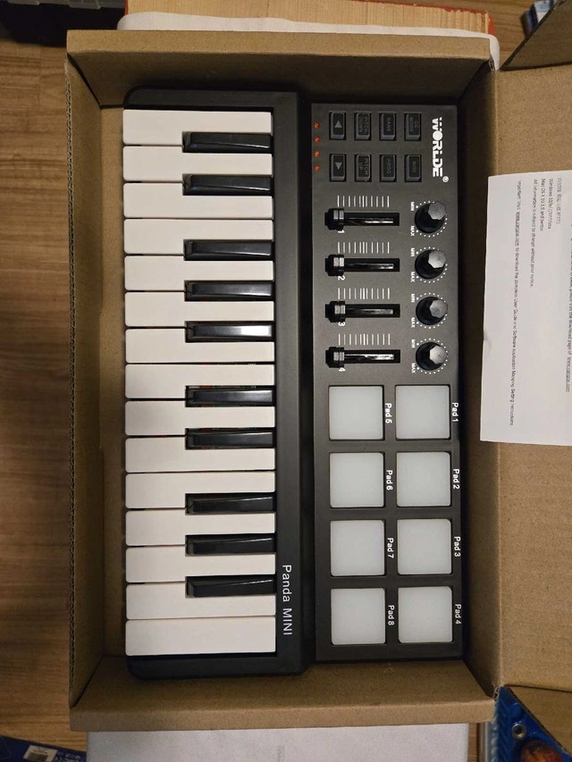 This is a Worlde Panda Mini USB MIDI controller keyboard that is in new condition. It features 25 keys with velocity, 8 trigger pads with velocity, 4 assignable control knobs, and 4 banks for different settings, compatible with Win/WinXP/Vista/Win7 and Mac OSX. Looking at similar MIDI keyboards, I think $80 is a fair price. If the ad is still up, the item is available!
