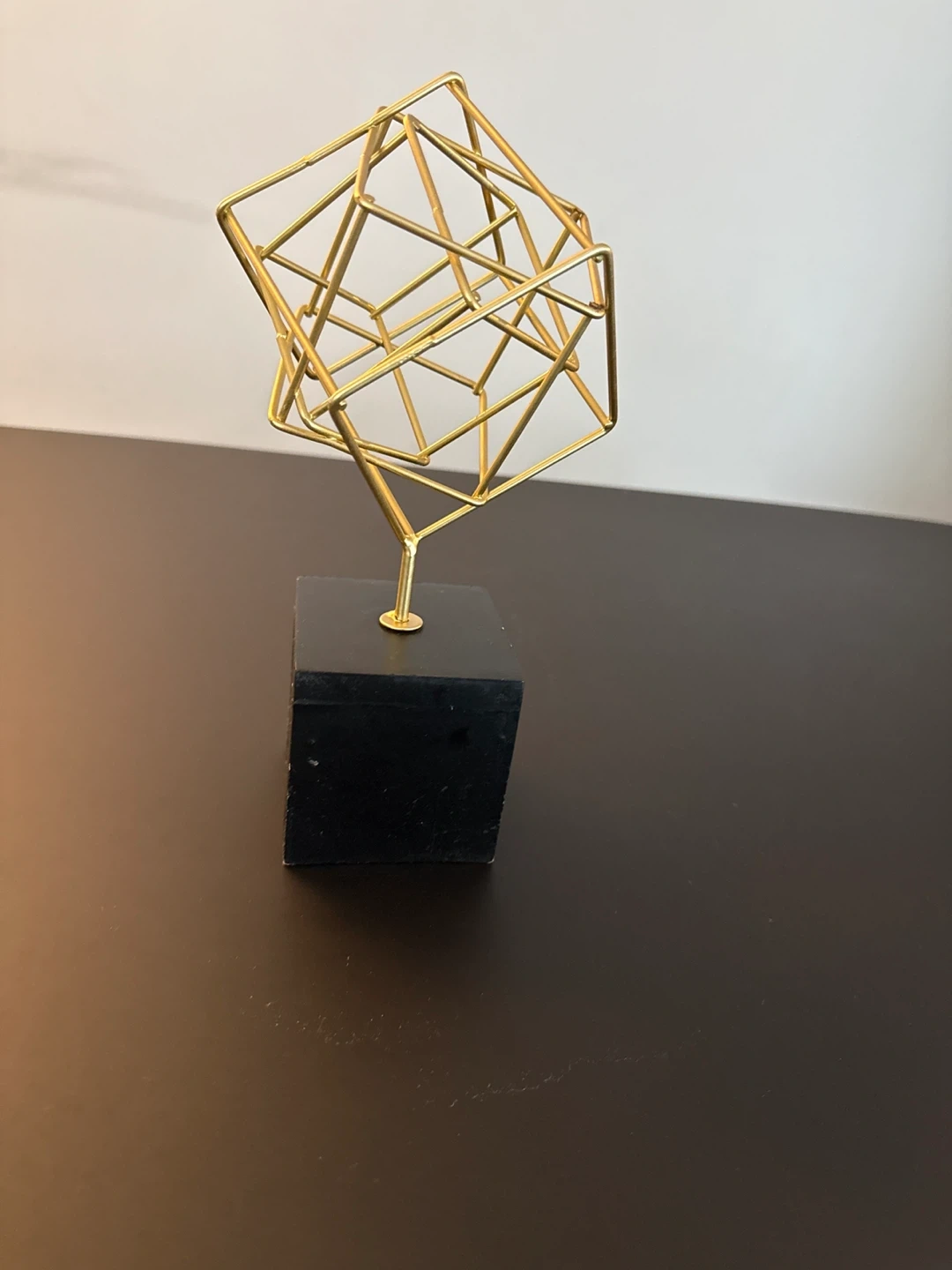This eye-catching gold geometric sculpture is sure to add a modern touch to any room! It features a unique cube design made of gold-toned metal, mounted on a sleek black base. Perfect for adding a bit of flair to your bookshelf or desk