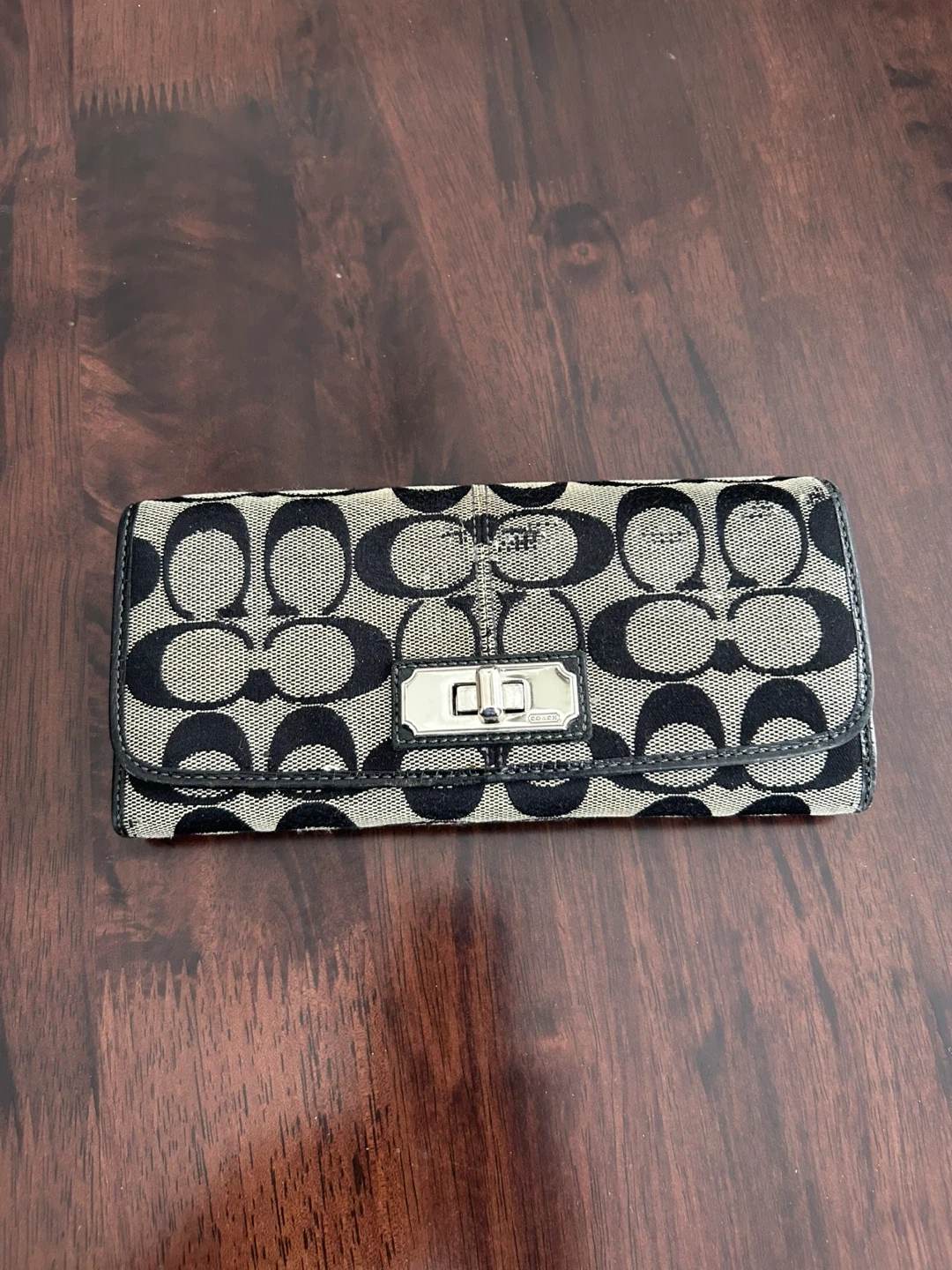 Selling a Coach wallet with a signature design. It's in great condition and has a secure closure. Perfect for keeping your cards and cash organized!