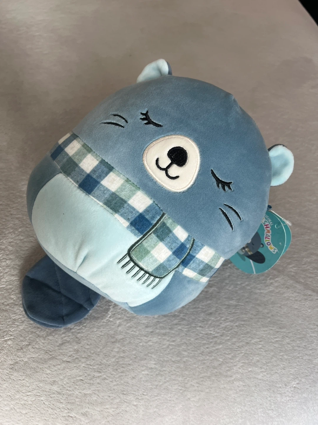 NEW. Tag attached. Looking to add a cuddly friend to your collection? This Squishmallows plush is brand new with tag attached and ready for a new home! This is River the Beaver, a super soft and huggable plush toy. It has a cute plaid scarf and sweet embroidered details