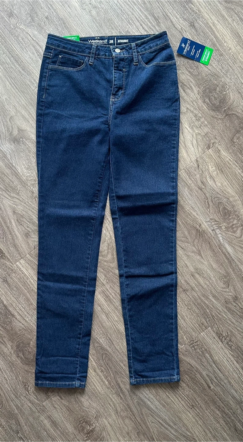 Weekend Denim straight jeans in size 28. These jeans are a dark wash and have a classic, straight leg fit. They appear to be in new condition with tags still attached!