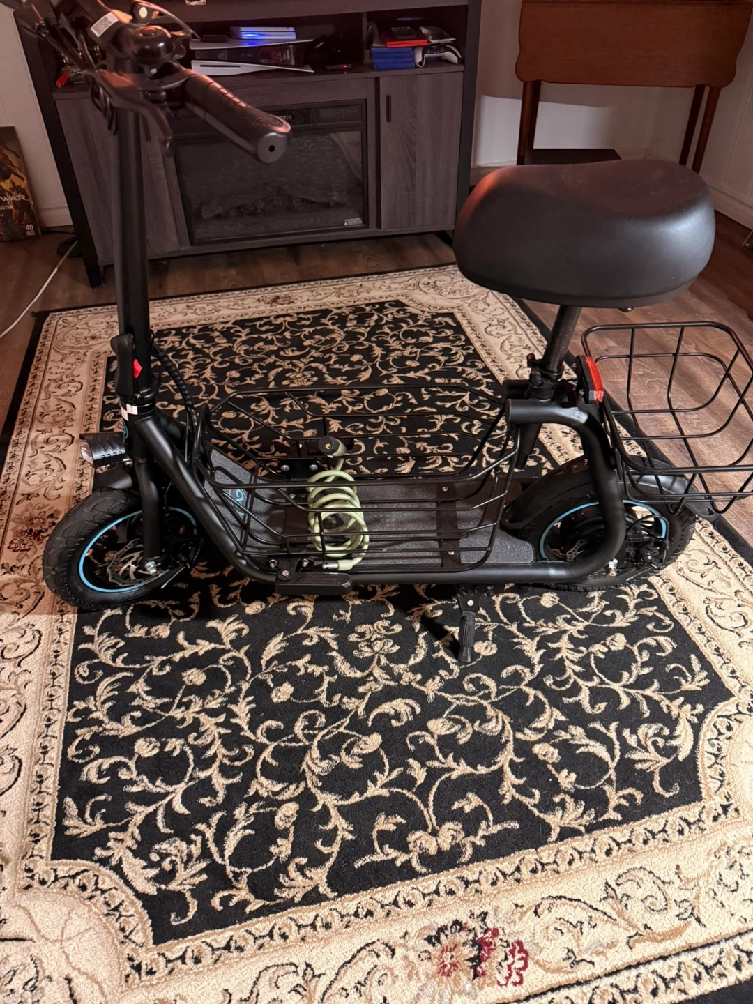 Selling a black electric scooter that comes with a seat and a basket! It's perfect for getting around town. It looks like it's in good condition and ready for a new owner