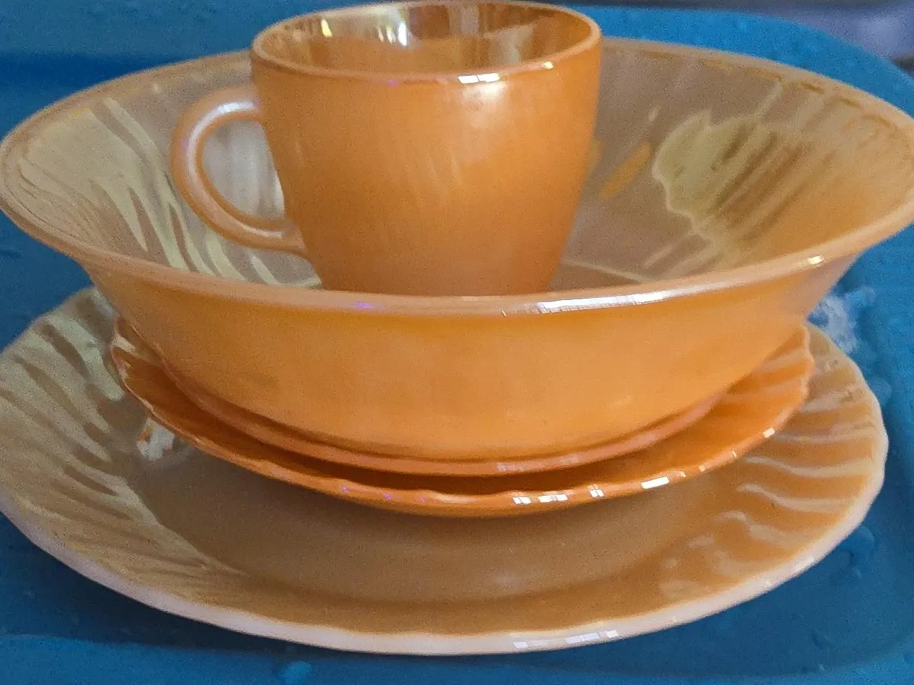 Here's a lovely vintage peach lusterware set! It includes a cup, bowl, and two plates. The set has a beautiful iridescent sheen, perfect for adding a touch of vintage charm to your kitchen or collection
