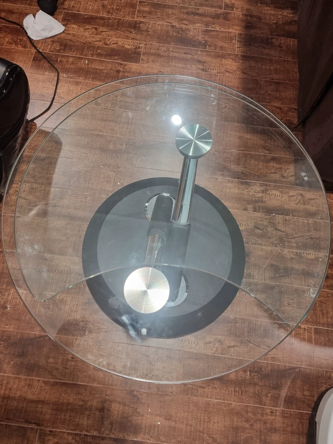 Selling a round glass coffee table with a black base. It's in good condition and would look great in any living room! The table has a modern design and is perfect for small spaces