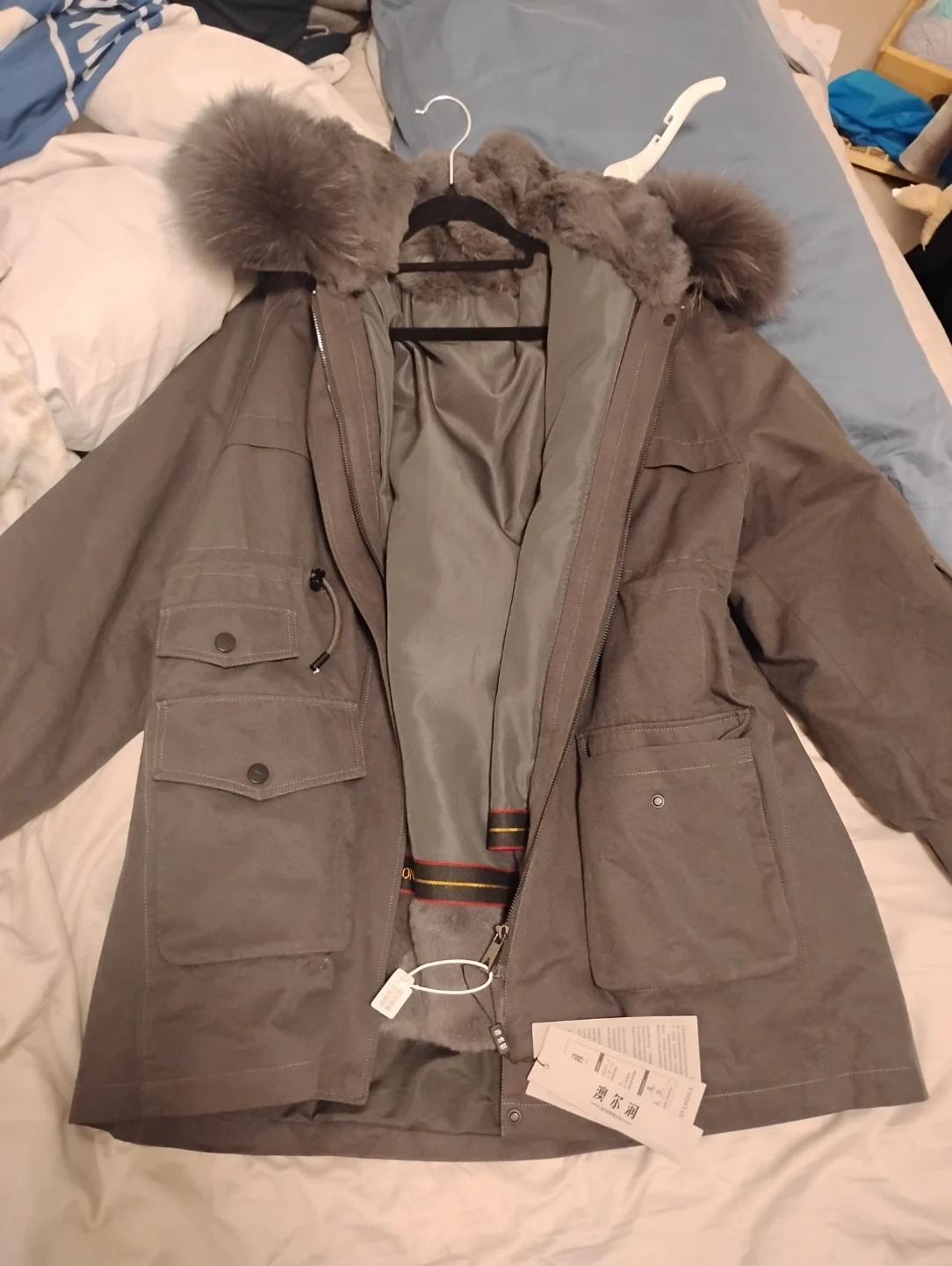 Selling a XXL size parka jacket made of imported polyester-cotton, with rabbit fur lining and raccoon fur collar. This stylish parka features a unique design and comfortable fit, perfect for staying warm during the colder months!
