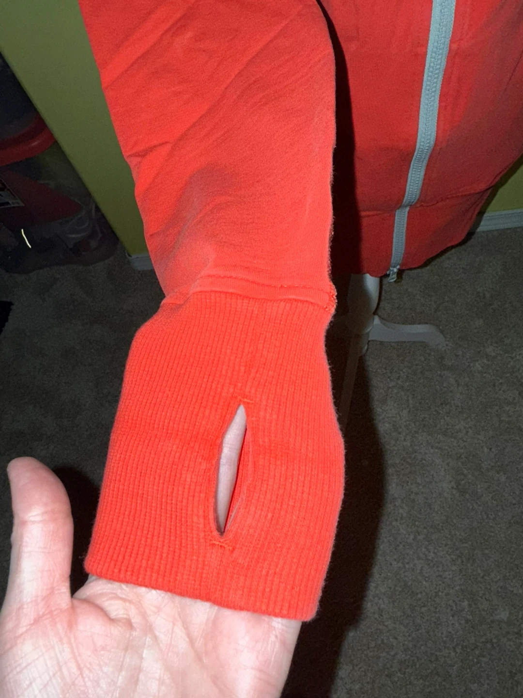 Selling a Lululemon Scuba Hoodie in a vibrant red colour! It's a size 12. The hoodie features thumbholes and a unique patterned lining. Perfect for workouts or casual wear!