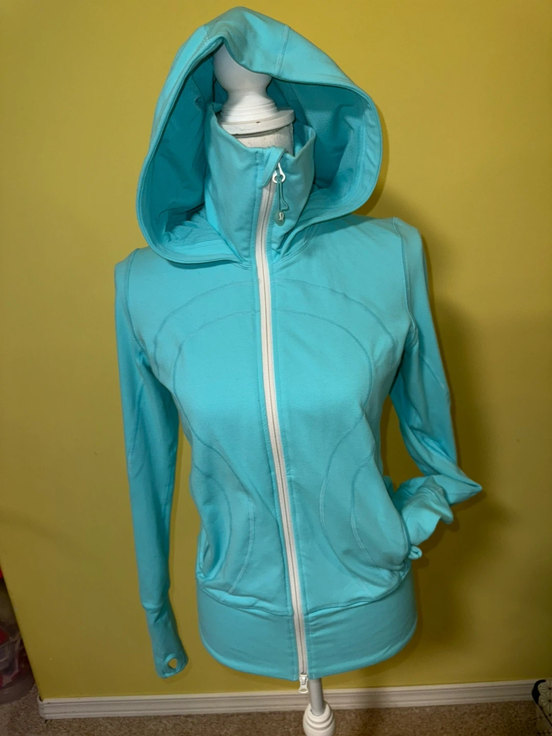 Selling a Lululemon Scuba Hoodie in a lovely turquoise colour! It's in great condition and features thumb holes for extra comfort on those chilly days. Perfect for workouts or just lounging around!