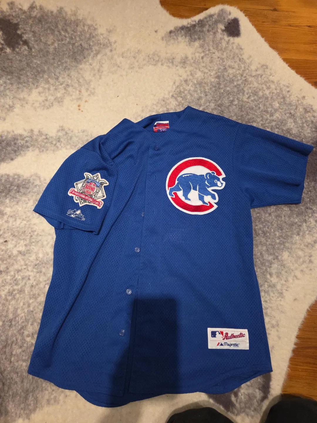 Selling a Chicago Cubs jersey, featuring Sosa #21 on the back! It's a blue Majestic Athletic jersey with the Cubs logo on the front and a commemorative patch on the sleeve