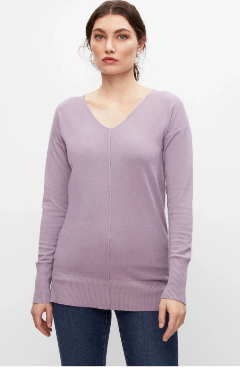 A cozy purple long sleeve top with a flattering V-neck. It's in great condition and ready for a new wardrobe! This soft, lightweight, ribbed knit sweater is all about style and comfort. You'll love the topstitch details.