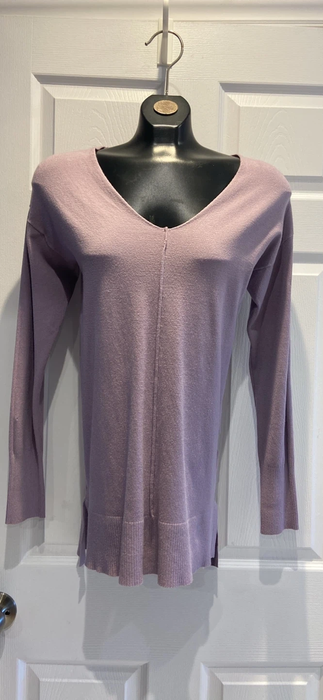 A cozy purple long sleeve top with a flattering V-neck. It's in great condition and ready for a new wardrobe! This soft, lightweight, ribbed knit sweater is all about style and comfort. You'll love the topstitch details.
