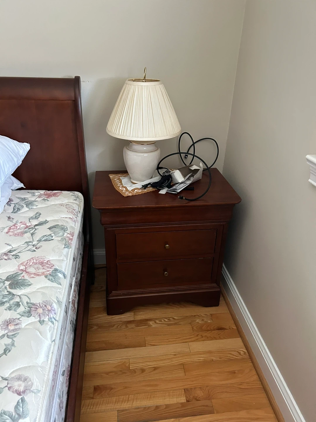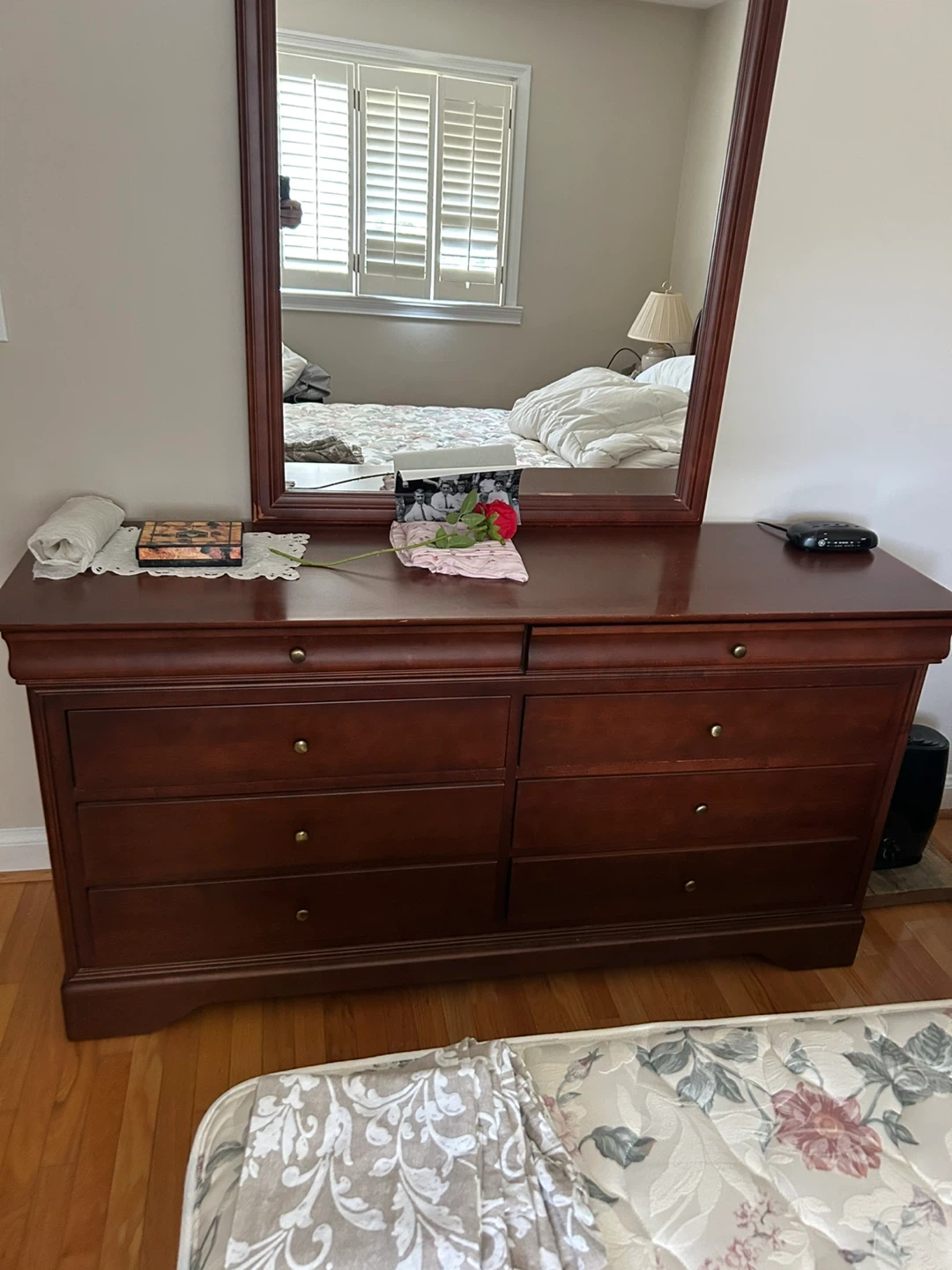 Selling a bedroom set that includes a dresser and a nightstand. They are in good condition and would be a great addition to any bedroom!