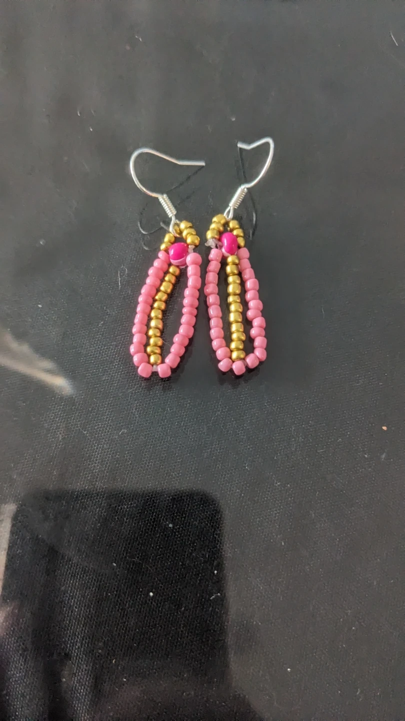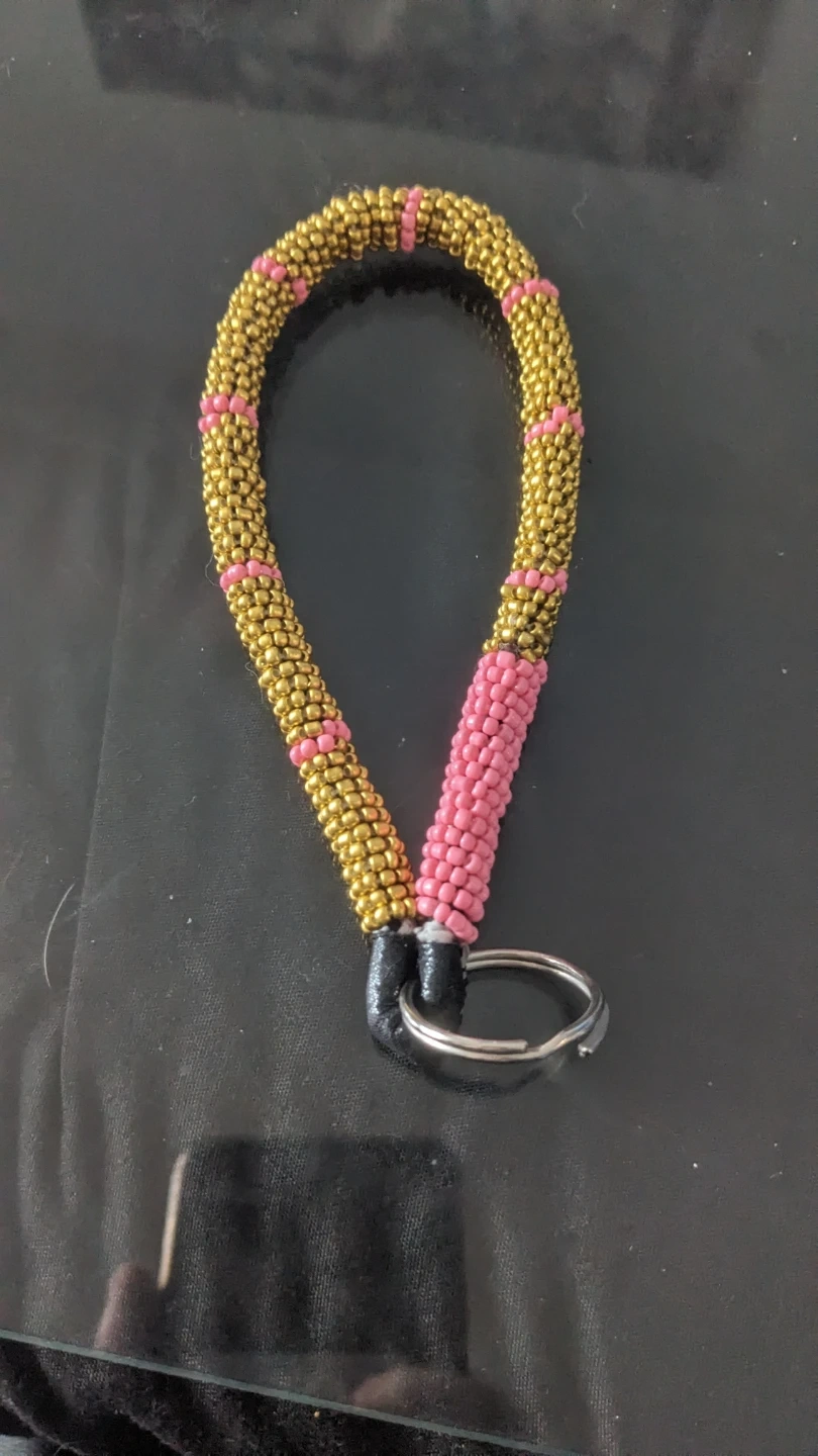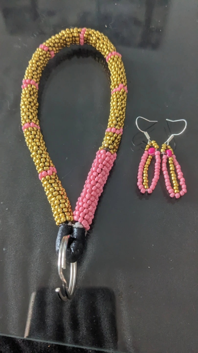 Here's a cute handmade set featuring a beaded keychain and matching earrings! The beads are gold and pink, adding a pop of colour to your accessories