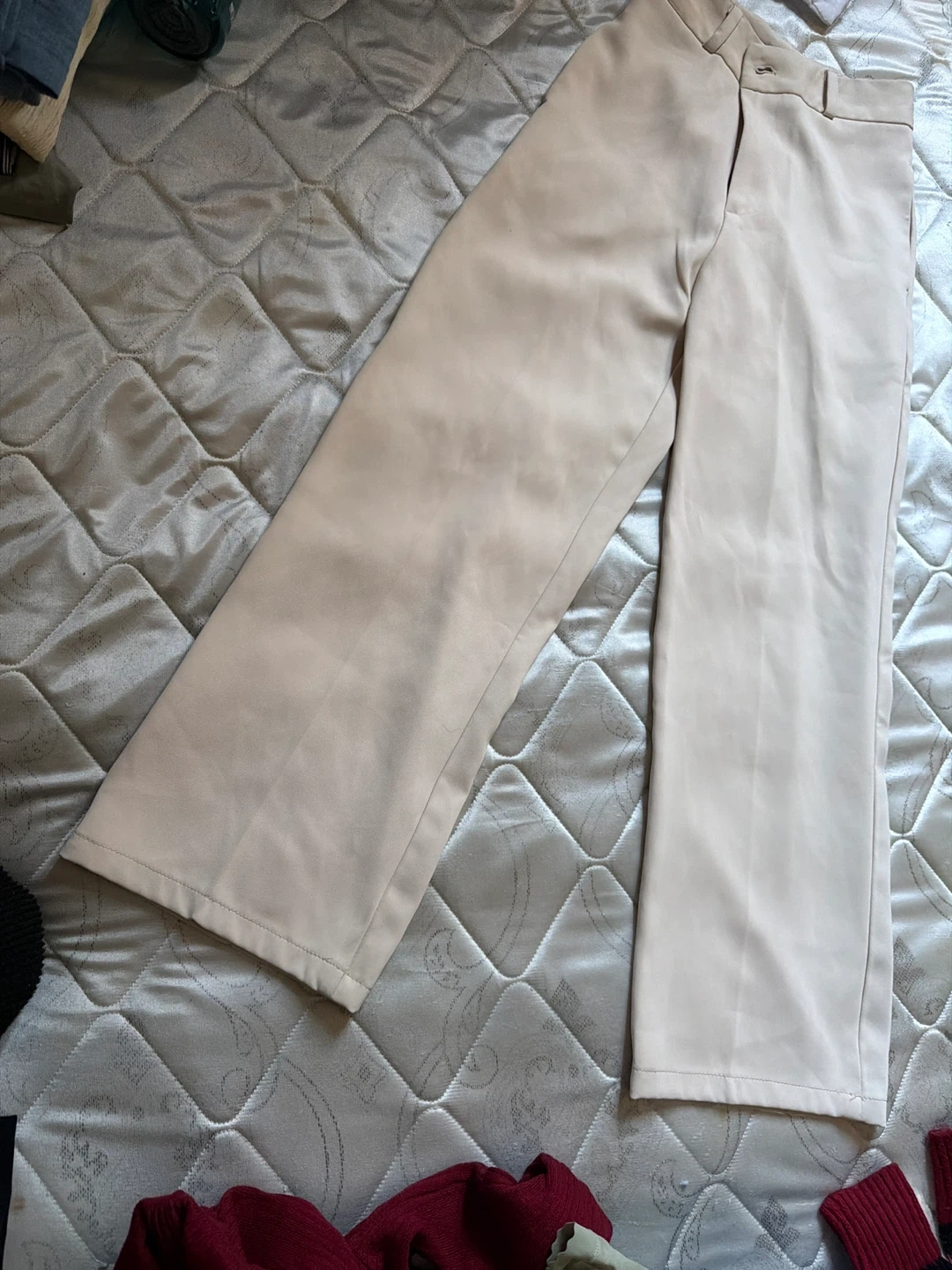 Selling a pair of beige wide leg semiformal pants.They're in great shape and ready for a new wardrobe! The colour is a versatile neutral, perfect for dressing up or down.size 26-27
