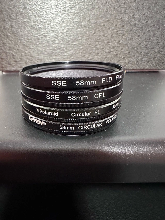Mint condition. Includes: SSE 58mm FLD filter, SSE 58mm CPL, Polaroid CPL 58mm, and Tiffen 58mm CPL, with filter folding pouch that can hold 6 filters.