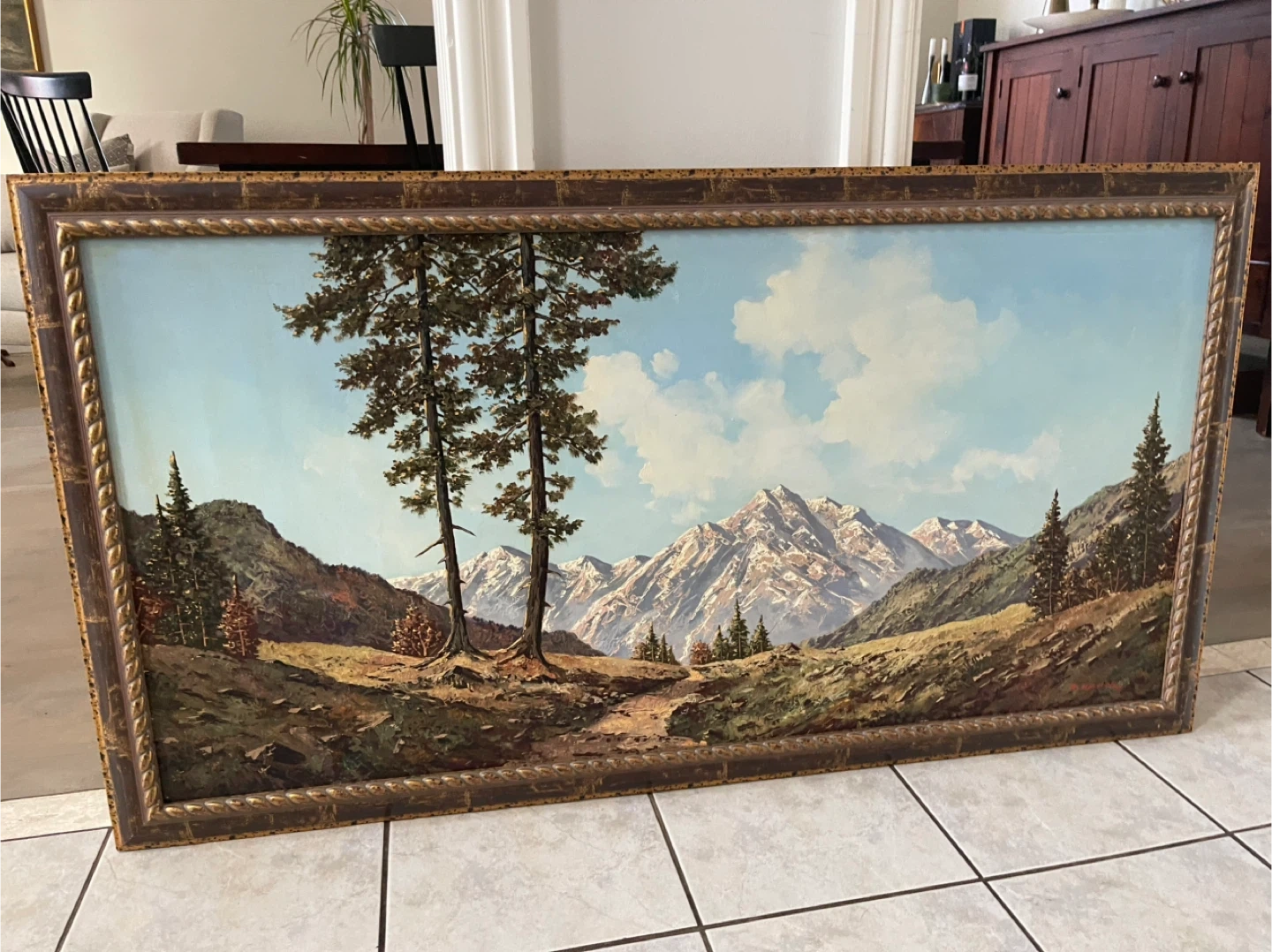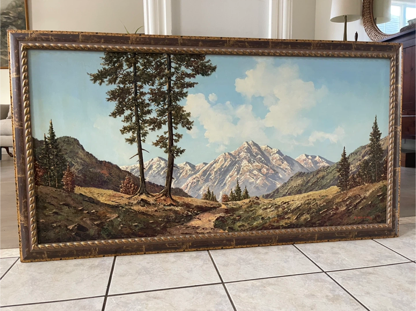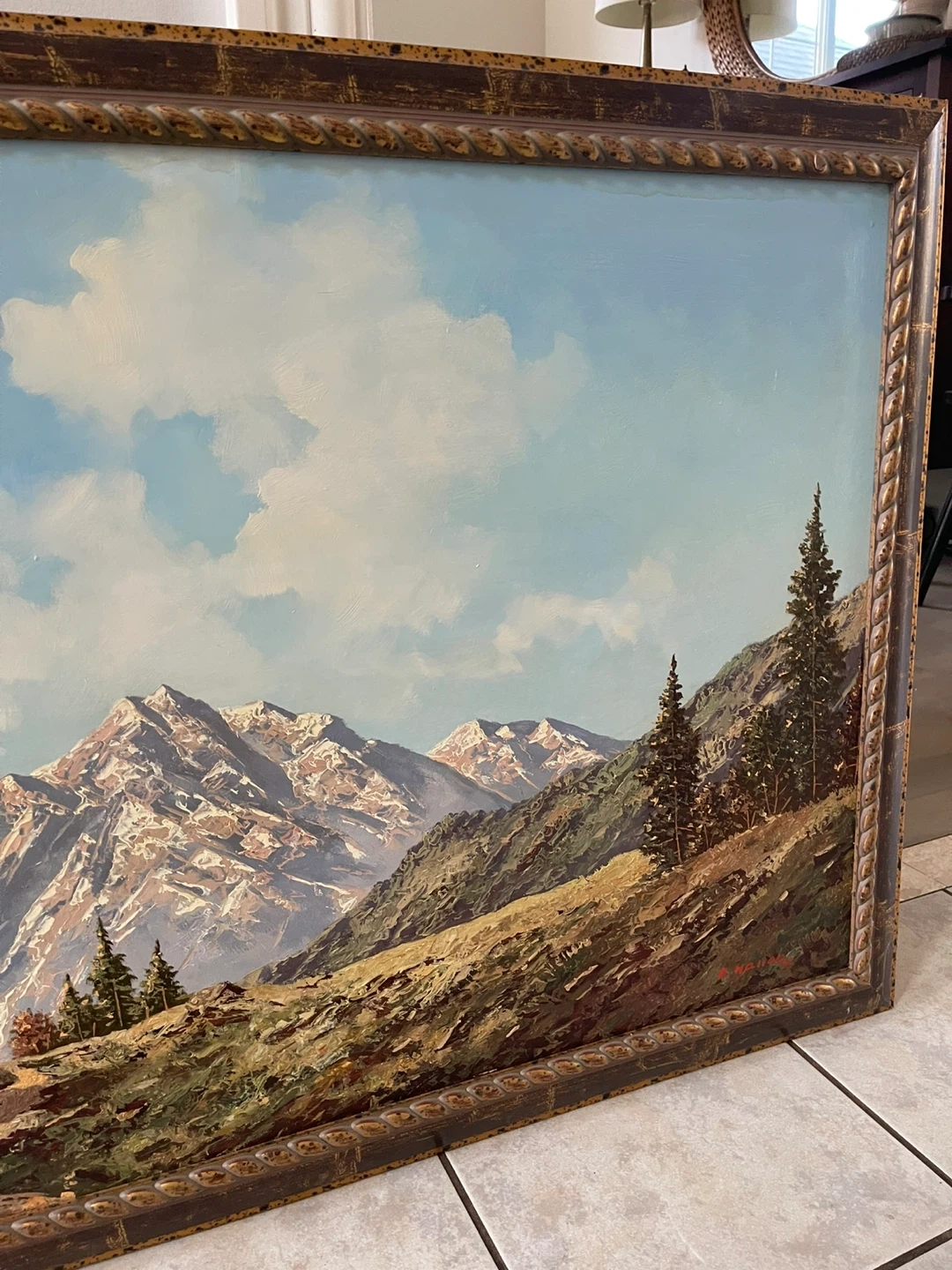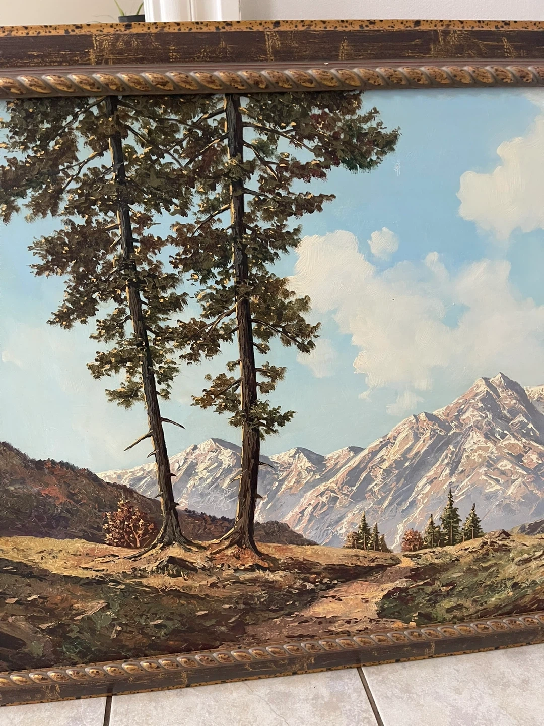 A beautiful framed oil painting of a mountain landscape scene. The wooden frame has a decorative, rope-like design. It's a lovely piece to add to your home decor!