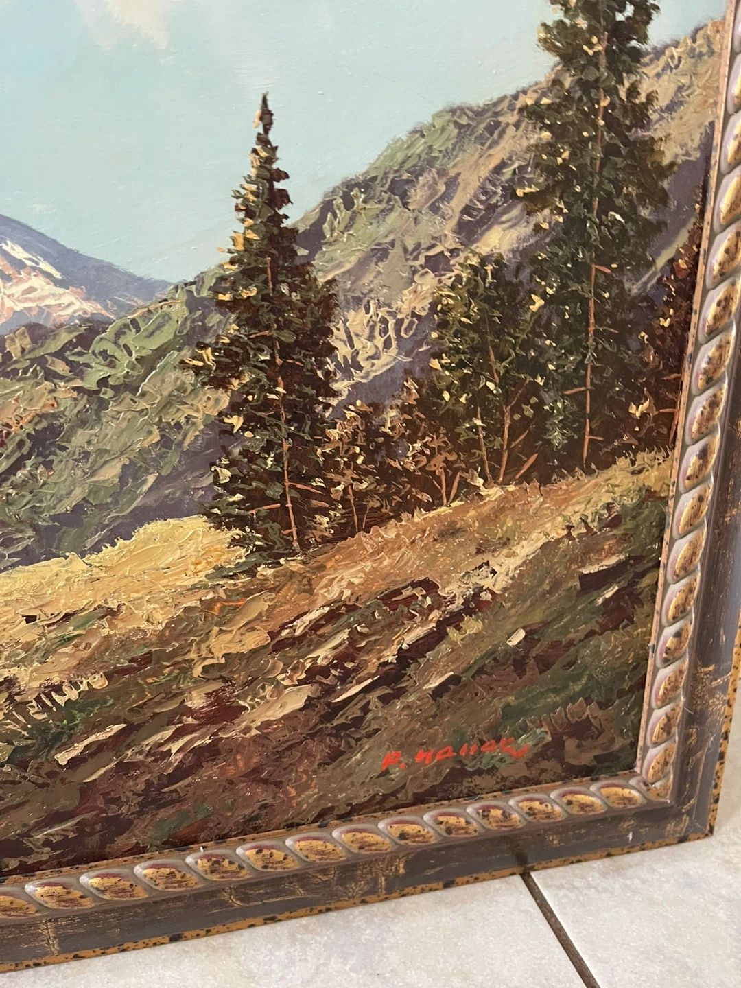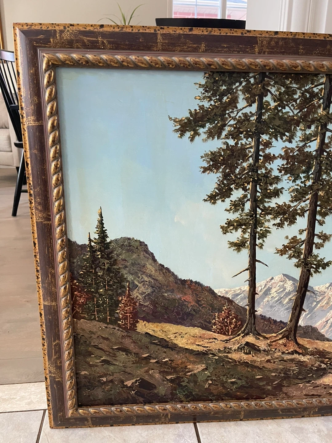 A beautiful framed oil painting of a mountain landscape scene. The wooden frame has a decorative, rope-like design. It's a lovely piece to add to your home decor!