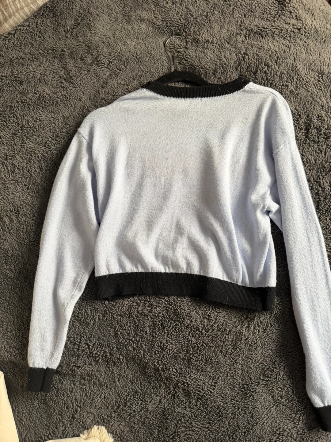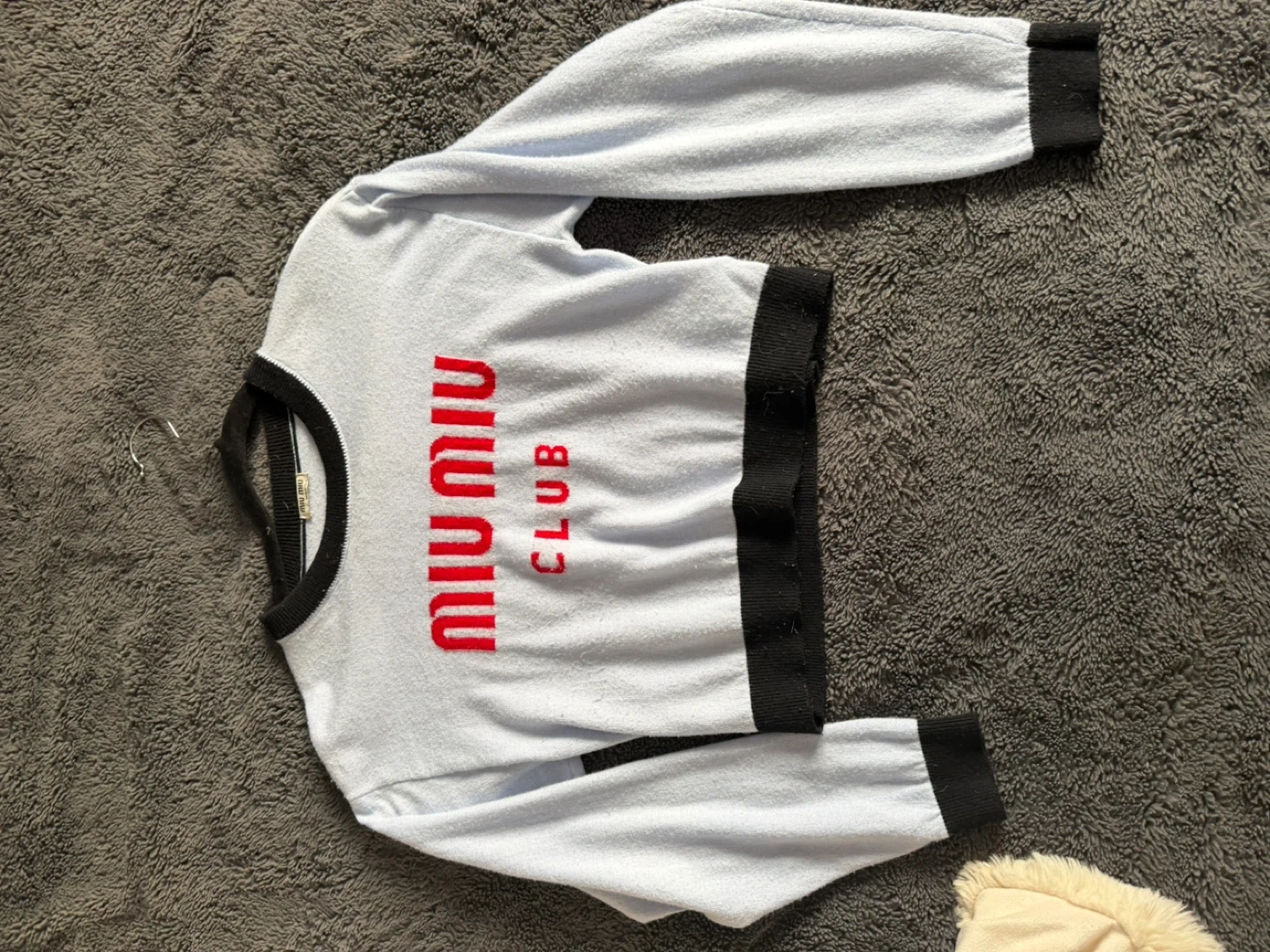 Selling a cute Miu Miu Club sweater! It's a light blue colour with red lettering and black trim. Made in Italy, this sweater is a stylish addition to any wardrobe