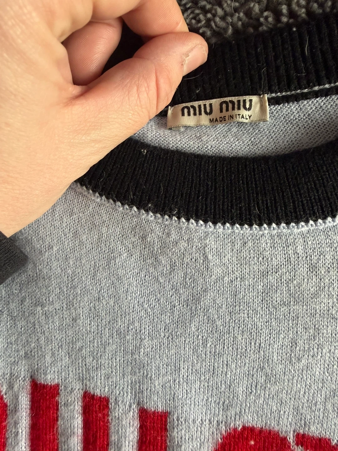 Selling a cute Miu Miu Club sweater! It's a light blue colour with red lettering and black trim. Made in Italy, this sweater is a stylish addition to any wardrobe