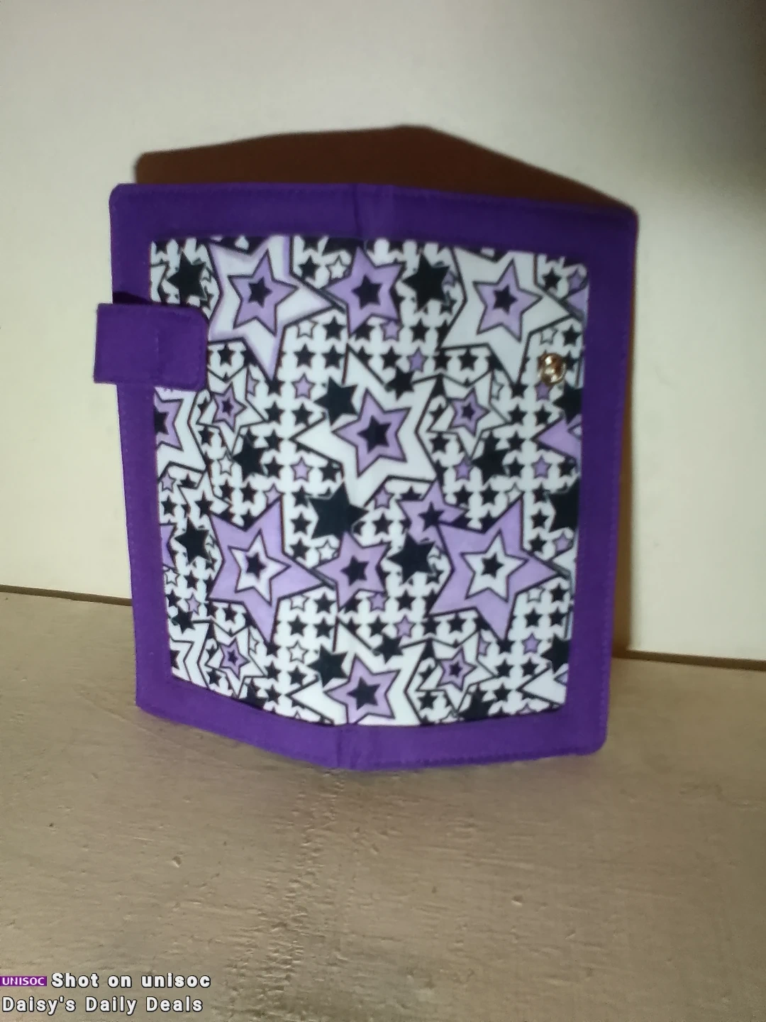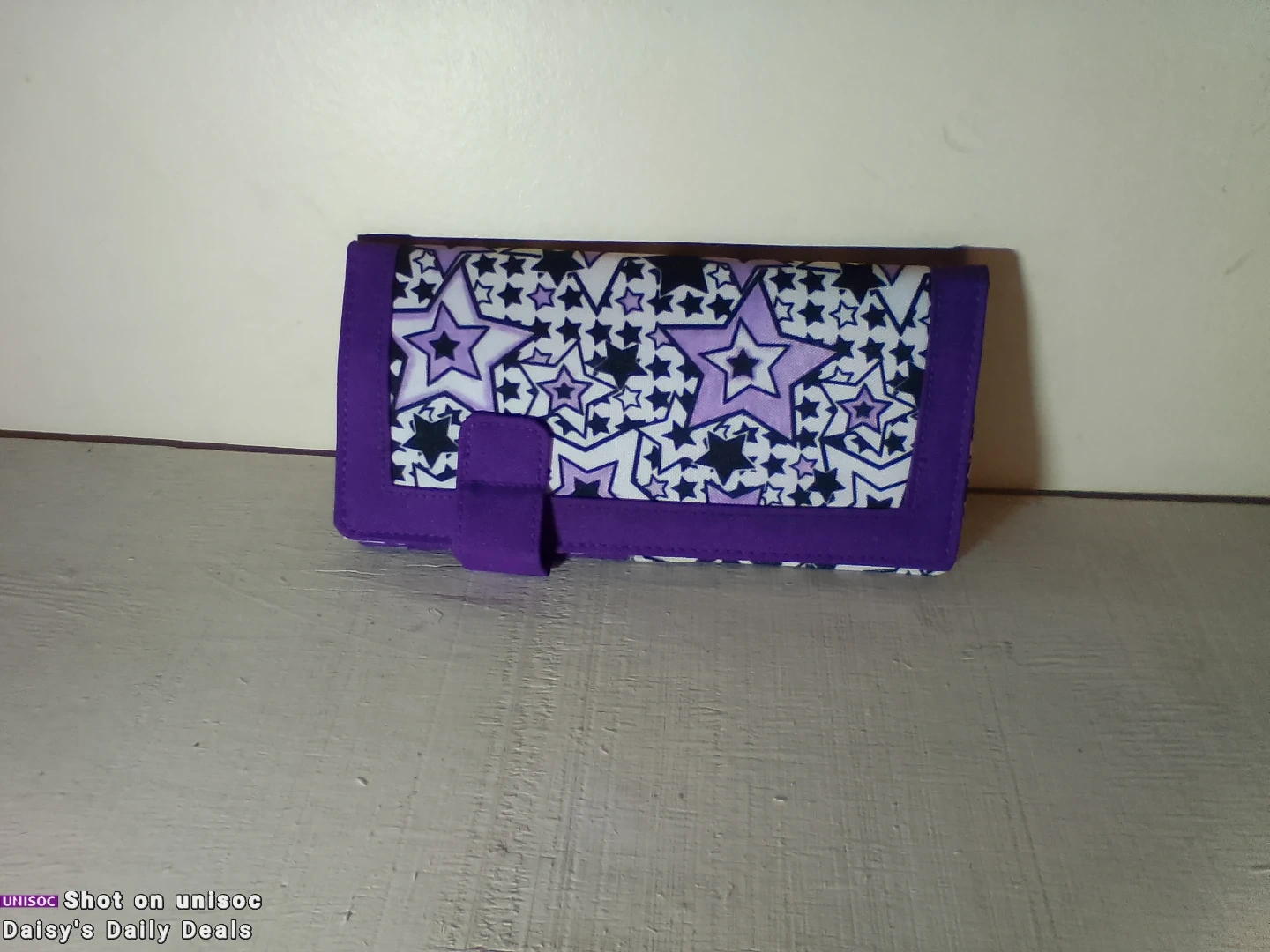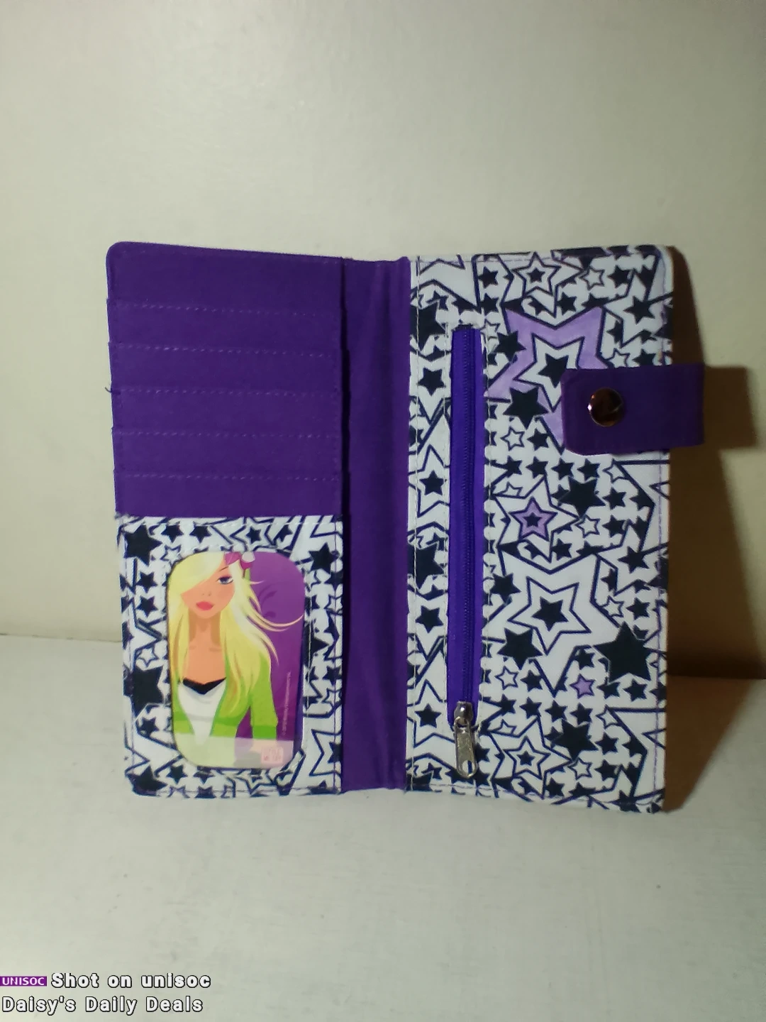 New wallet with a fun purple and black star pattern on the outside. It has a purple interior with card slots, 2 pocket folds, and a zippered pocket. Great for keeping your essentials organized!