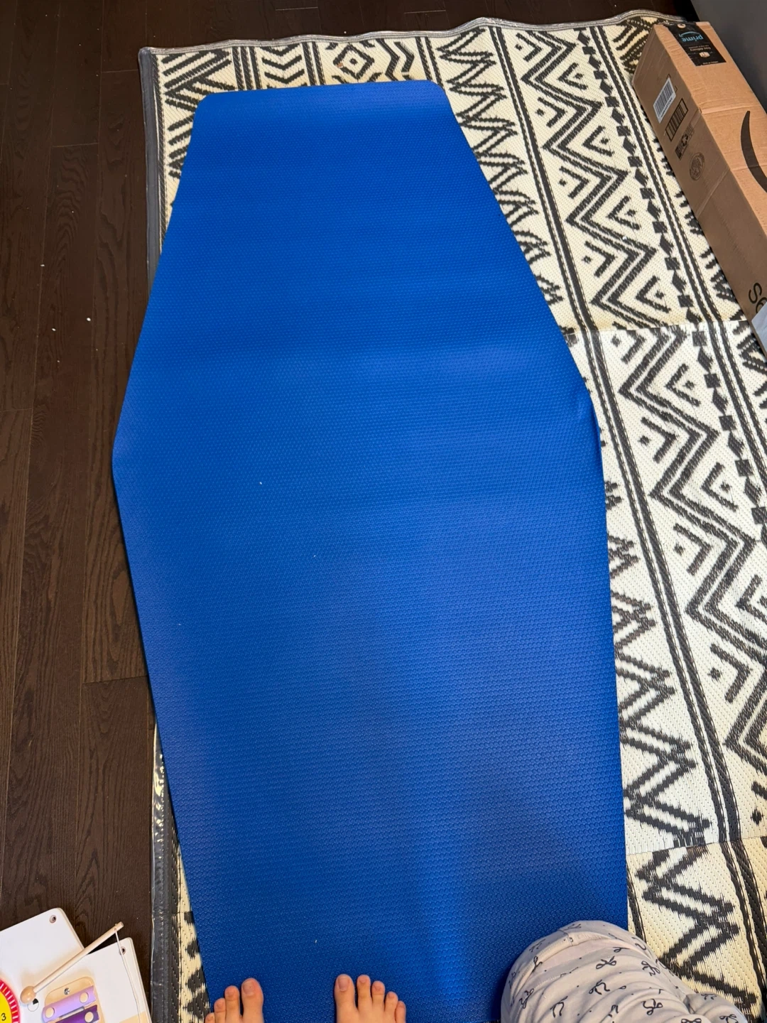 Selling a blue exercise mat. It's in great shape and perfect for home workouts! The texture provides a good grip, and it's easy to roll up and store when not in use
