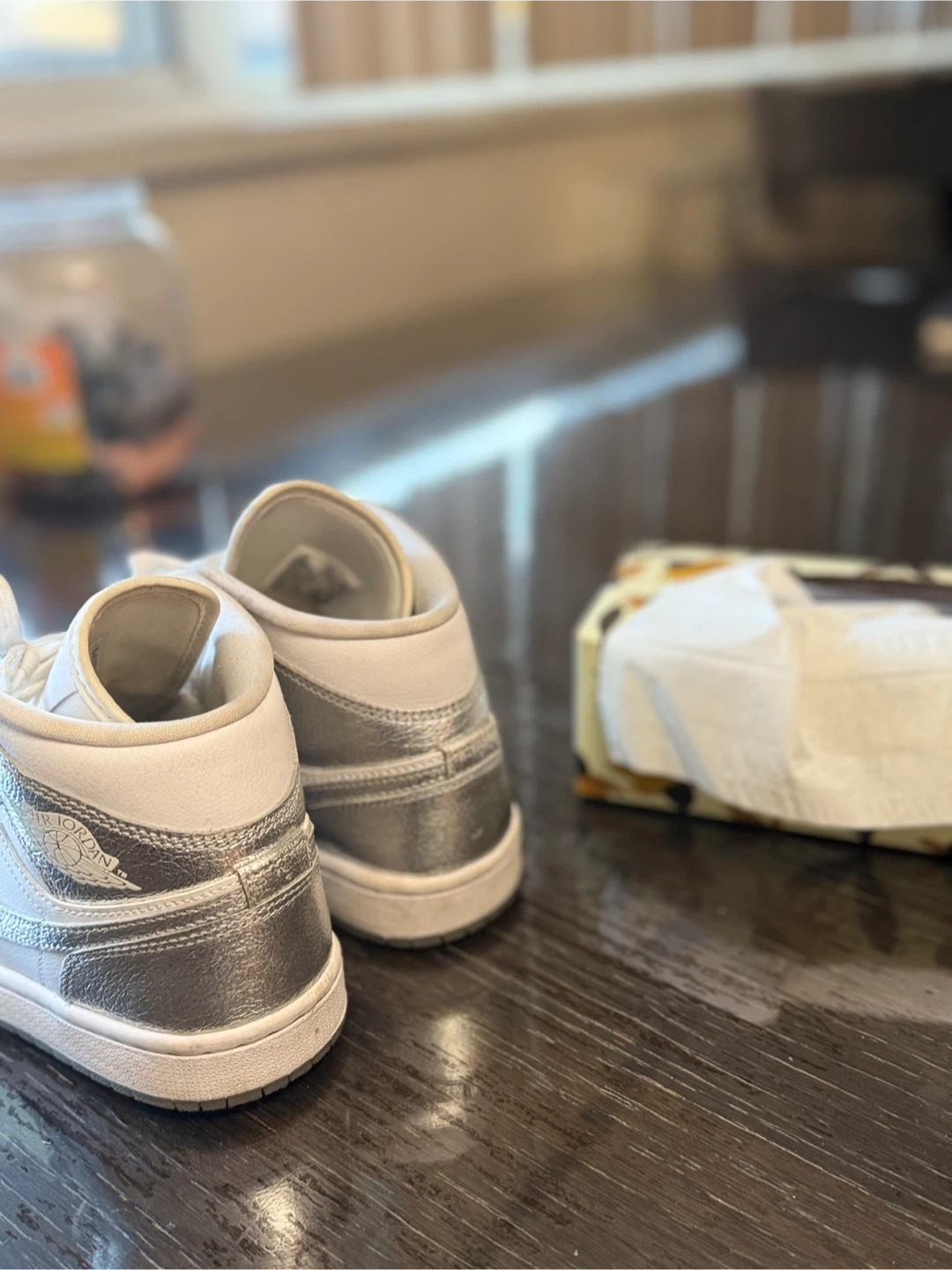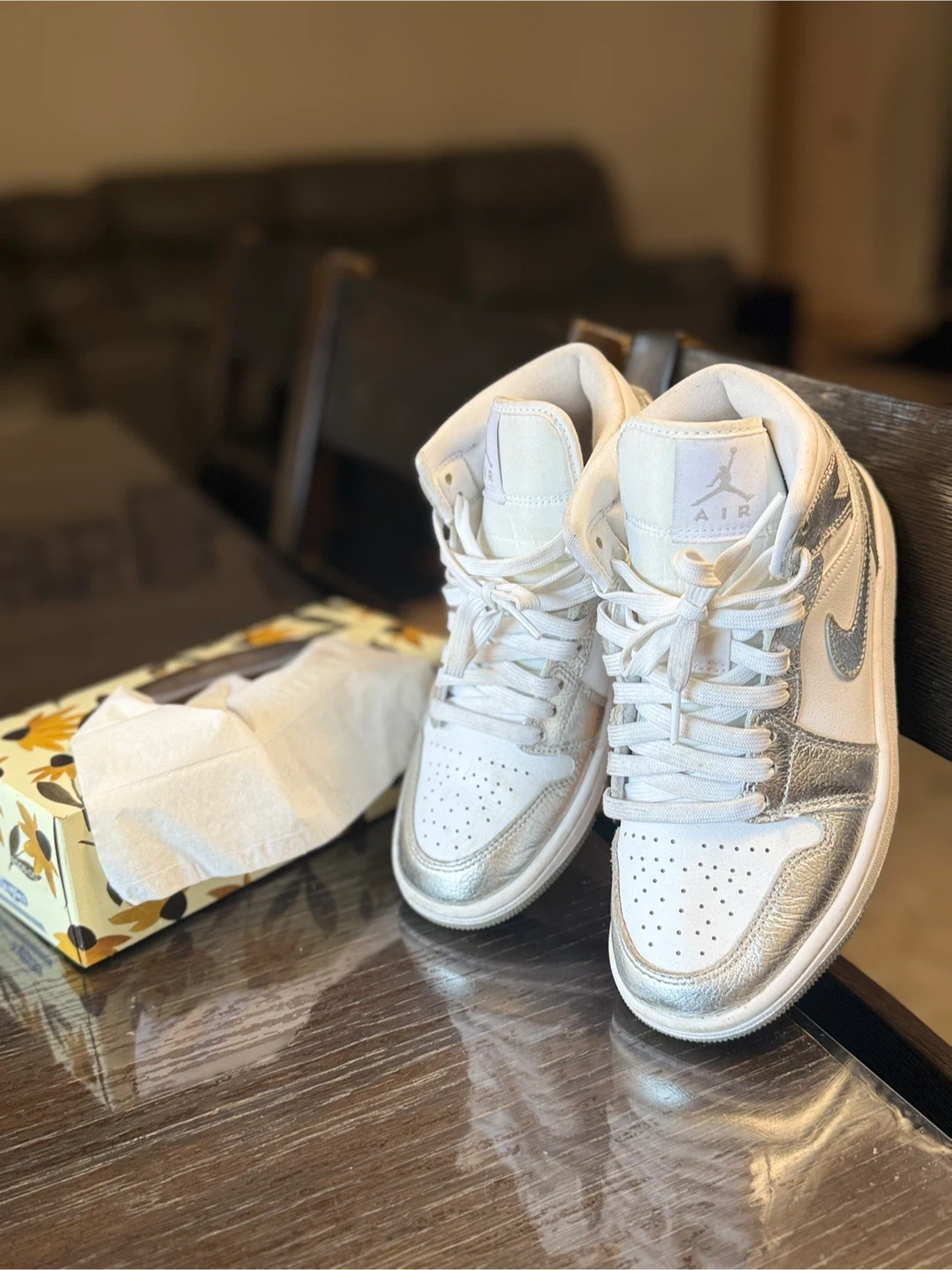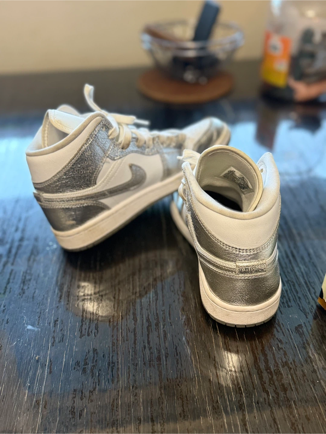 Selling a pair of Air Jordan 1 Mid sneakers in a stylish white and silver colourway. They are in great condition and ready for a new owner! Size is US 6.