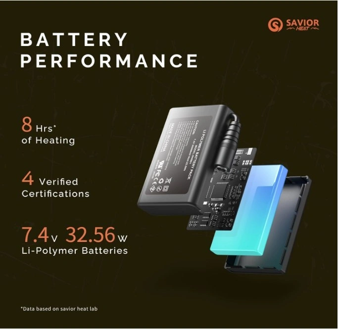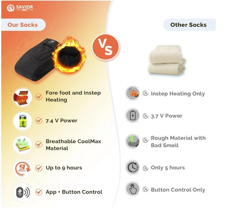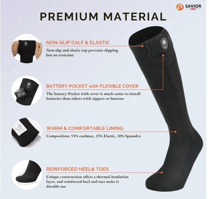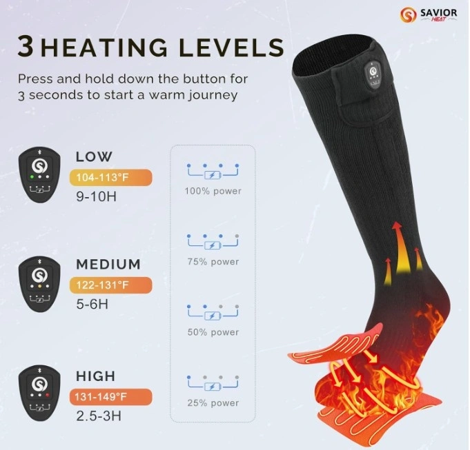 Compared with others' 5v 5000mah batteries heated socks, Savior heat's 7.4V battery heated socks have higher power and current, which makes them 21% warmer and last 20% longer time. The rechargeable heated socks feature 3 heat settings, High 140-150℉, Medium 122-133℉, and Low 104-113℉, they can last about 3-9 hours for a fully charged. Premium Coolmax+Elastic+Spandex material ensures you can feel more comfortable and breathable wearing experience, Please choose the correct size (S, M, L, XL) according to the size chart.
