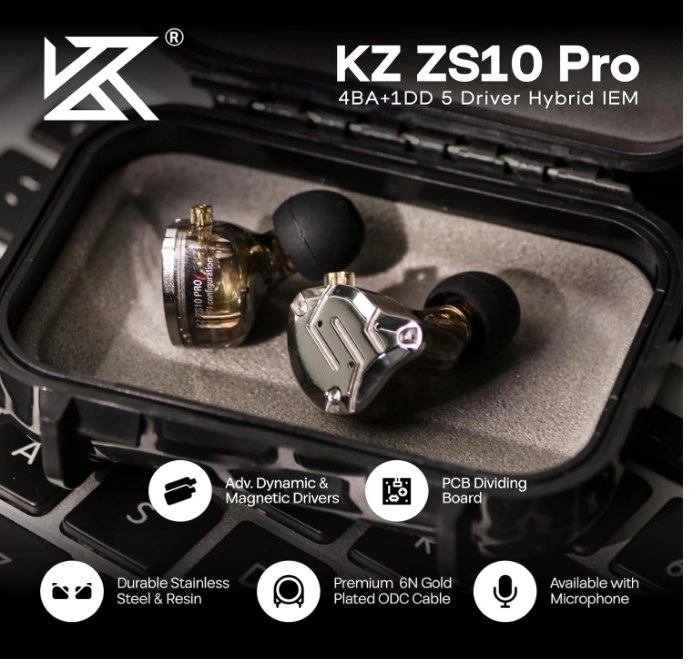 Upgraded 4BA+1DD Hybrid IEM Earphones with Magnetic Dynamic Unit. An upgraded version of KZ ZS10, the Pro features self-customized balanced armatures which includes two 30095 drivers for high frequency, two 50060 drivers for mid frequency. With this configuration, the sound is transient, dynamic and bright in all respects. While maintaining the previous performance, the high frequency of this model is extended to beyond 40kHz. It also adopts the second generation Tesla double magnetic dynamic unit.