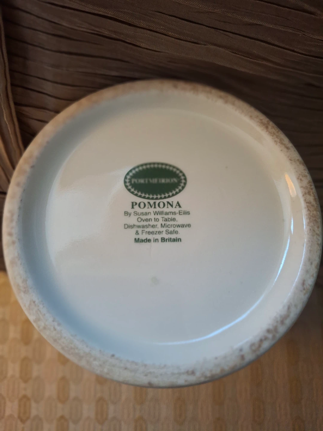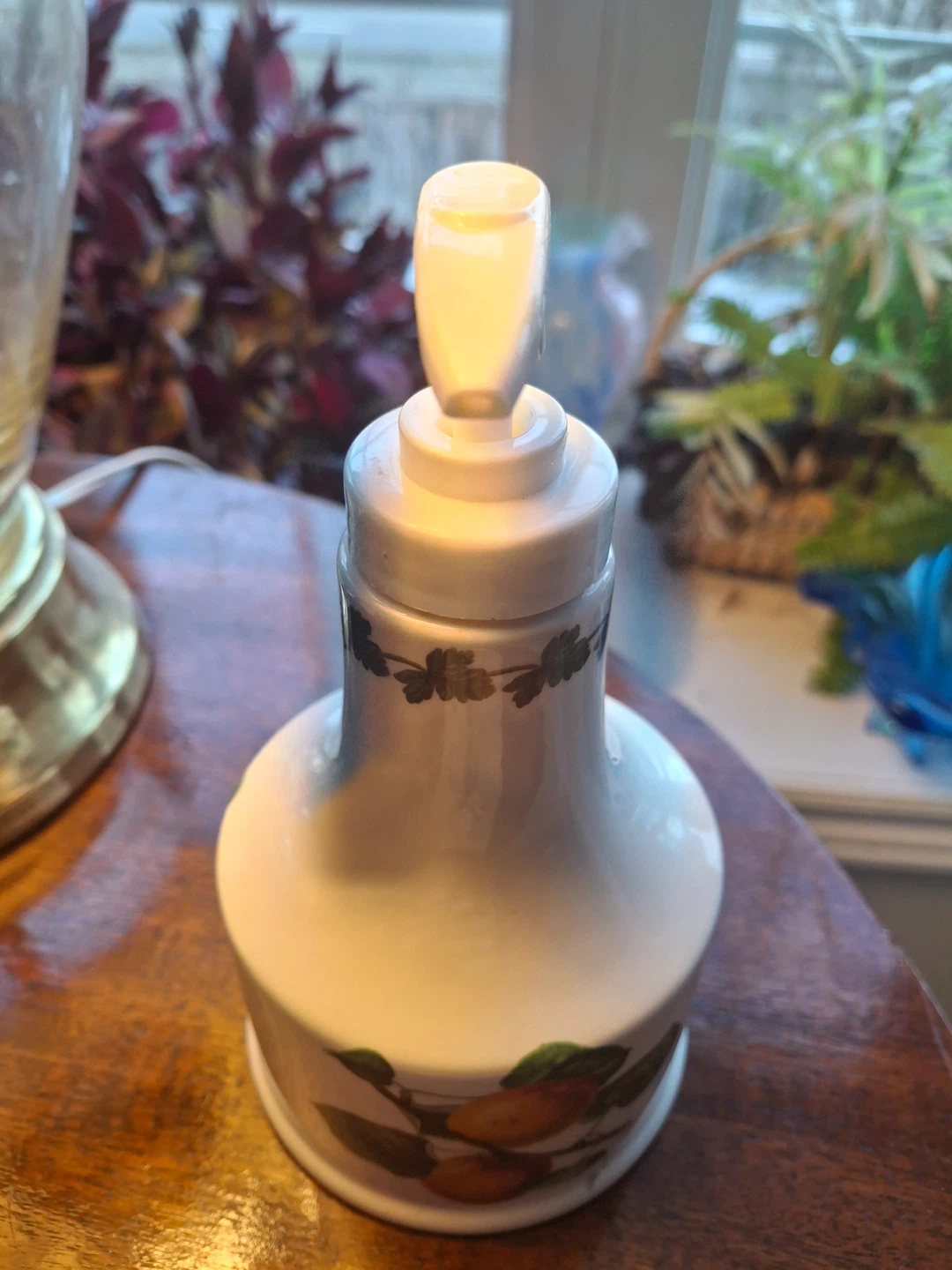 Portmeirion “Pomona Apricot” soap dispenser with a lovely fruit design. 7” high Made in Britain. Very good condition, but some discolouration on the bottom (the underside, not visible) as shown in the last photo. Have seen similar listings on eBay for $55+.