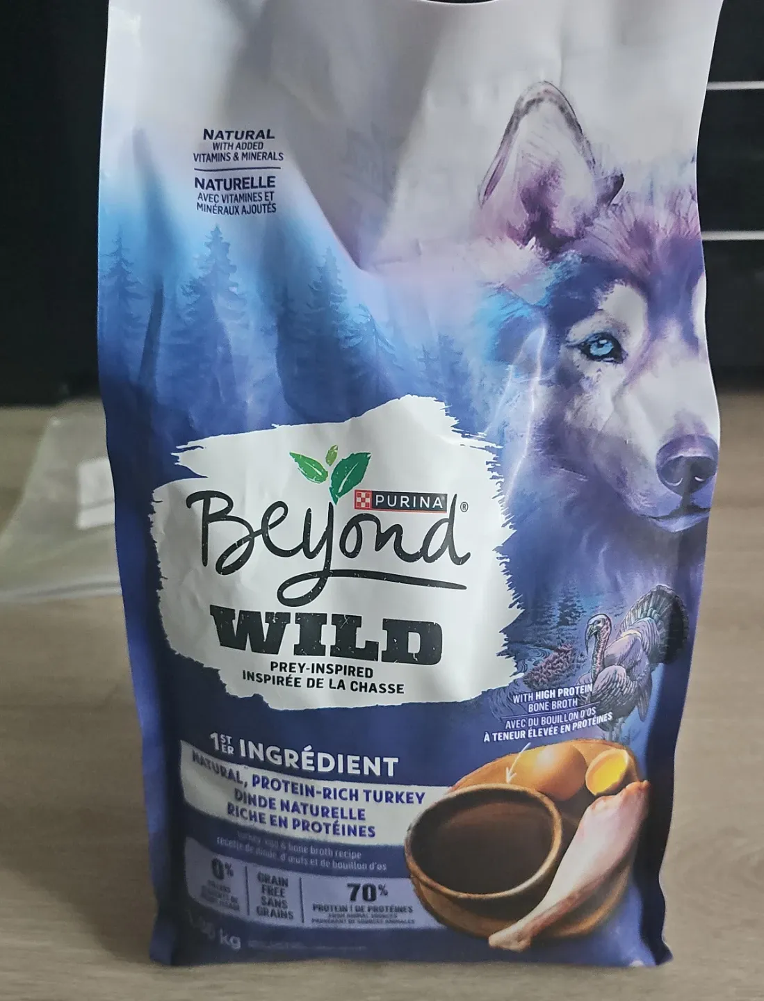 Selling a bag of Purina Beyond Wild dog food. It's a natural, protein-rich recipe with turkey as the first ingredient. Grain-free and contains 70% protein