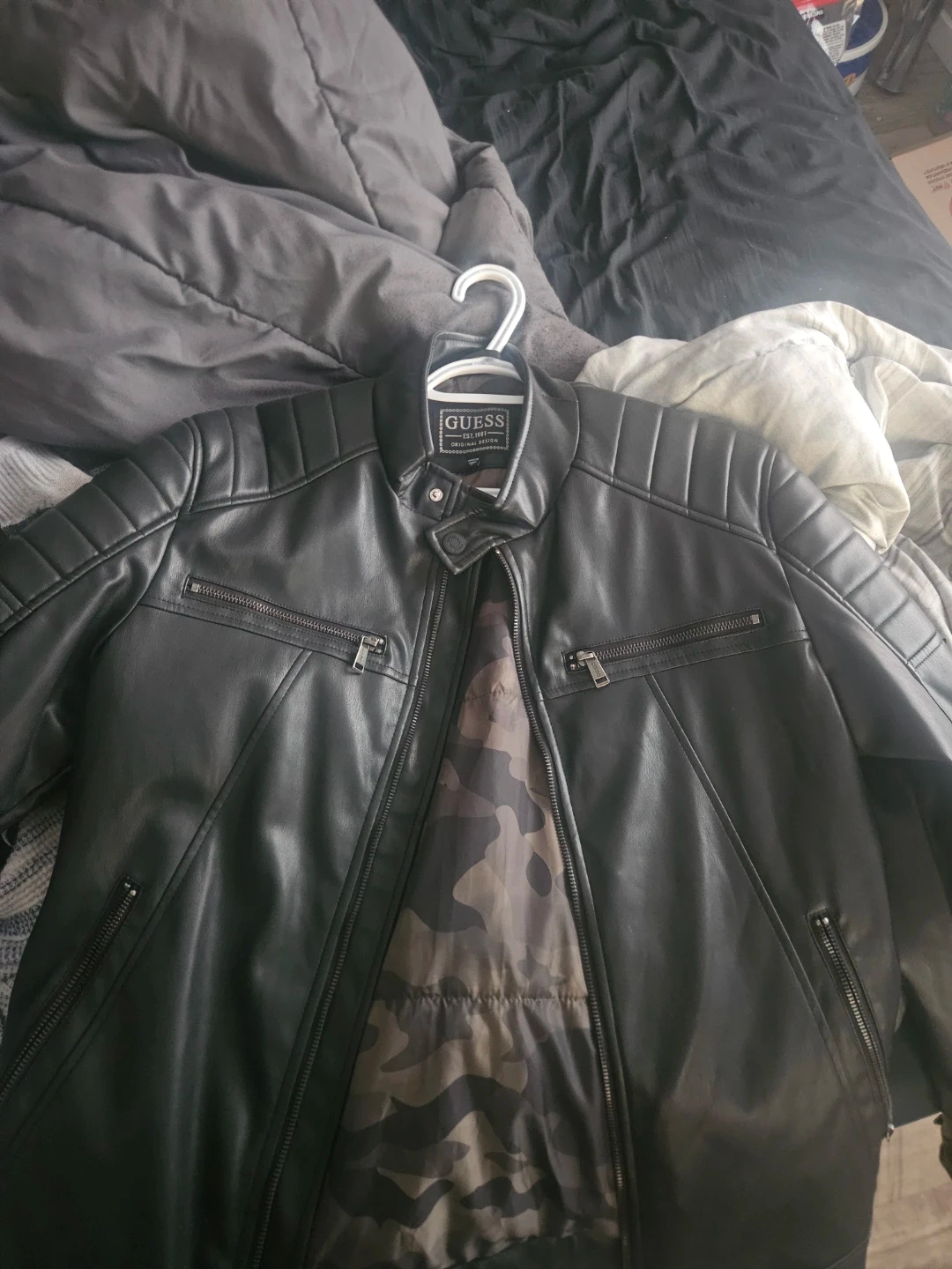 Stylish Guess faux leather jacket in black. Features a camo lining and a sleek design. Perfect for adding a touch of edge to your wardrobe!